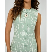 The Lucia Mini Dress is a fresh take on everyday dressing, crafted from a breathable cotton flax blend in sage green with a soft white organic geometric pattern. Featuring a high neckline, button-down front, and sleeveless cut, it’s equal parts structured and easygoing. Style it with sandals or wedges for a crisp, warm-weather look made for sunny days out.