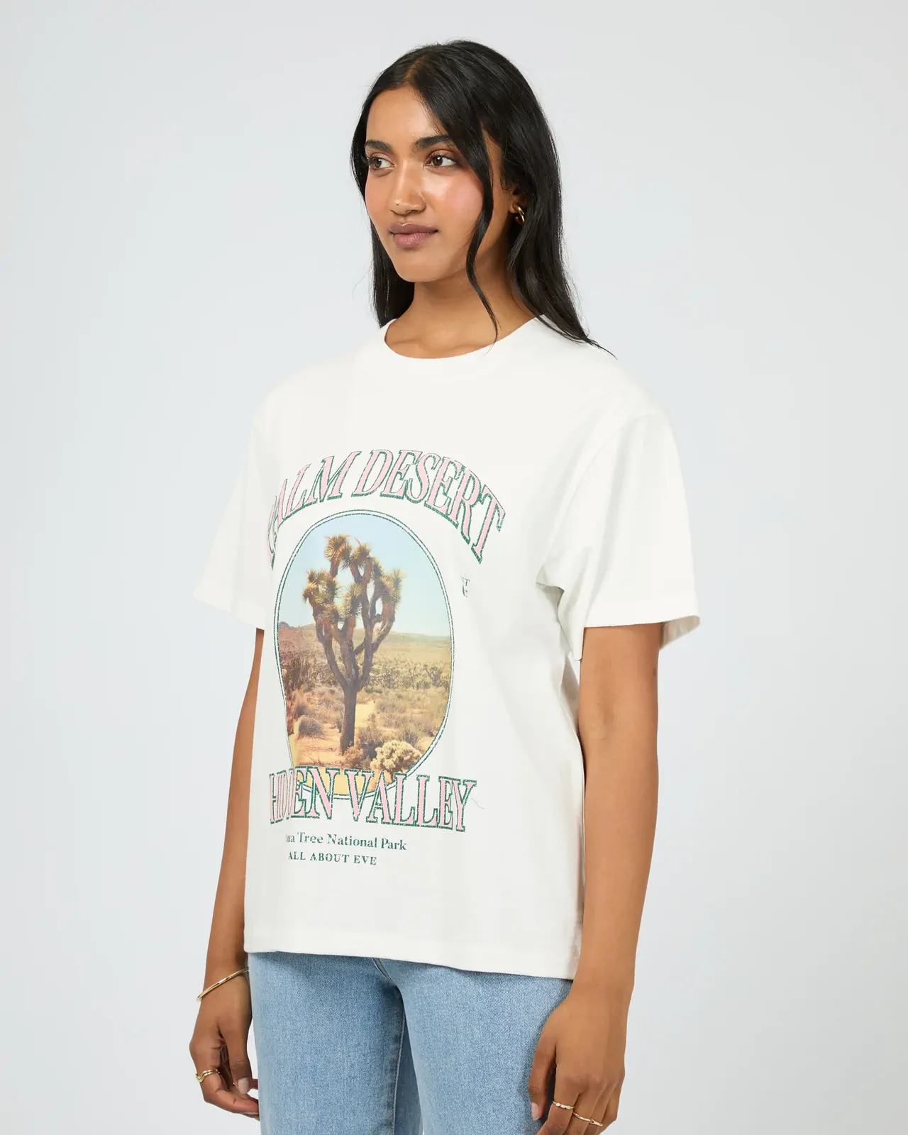 Get a sneak peek into the Joshua Tree National Park with the Palm Desert Box Tee in vintage white. This boxy fit tee will be your go-to for everyday errands and the days you want your outfit to say something extra. Featuring an All About Eve exclusive graphic, you will be the envy of those around you when wearing this effortlessly cool piece.