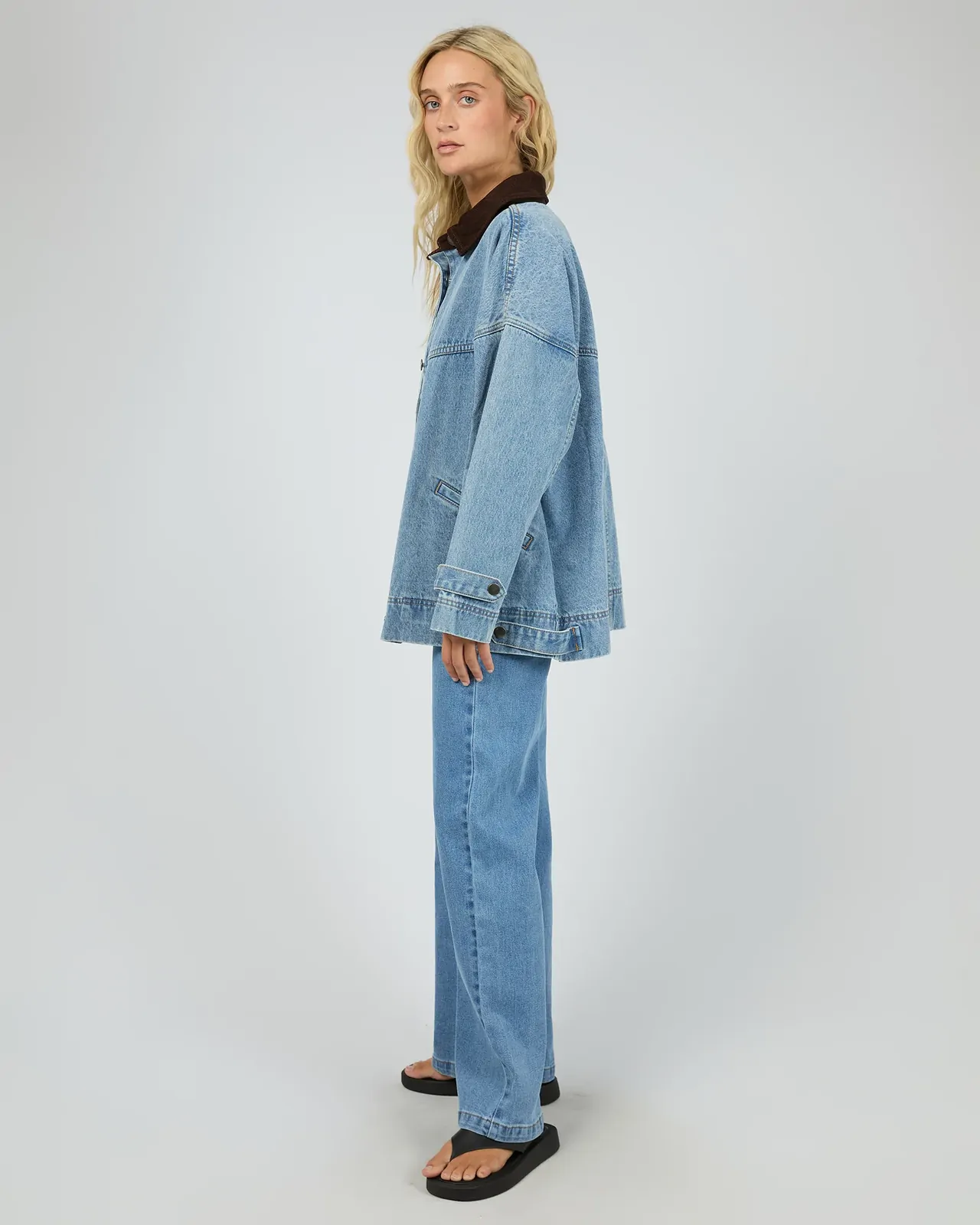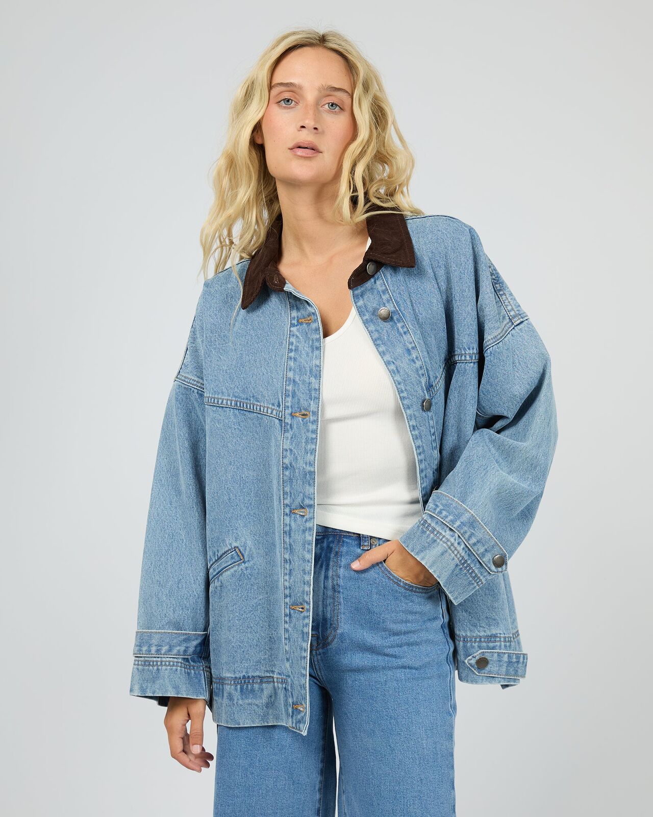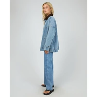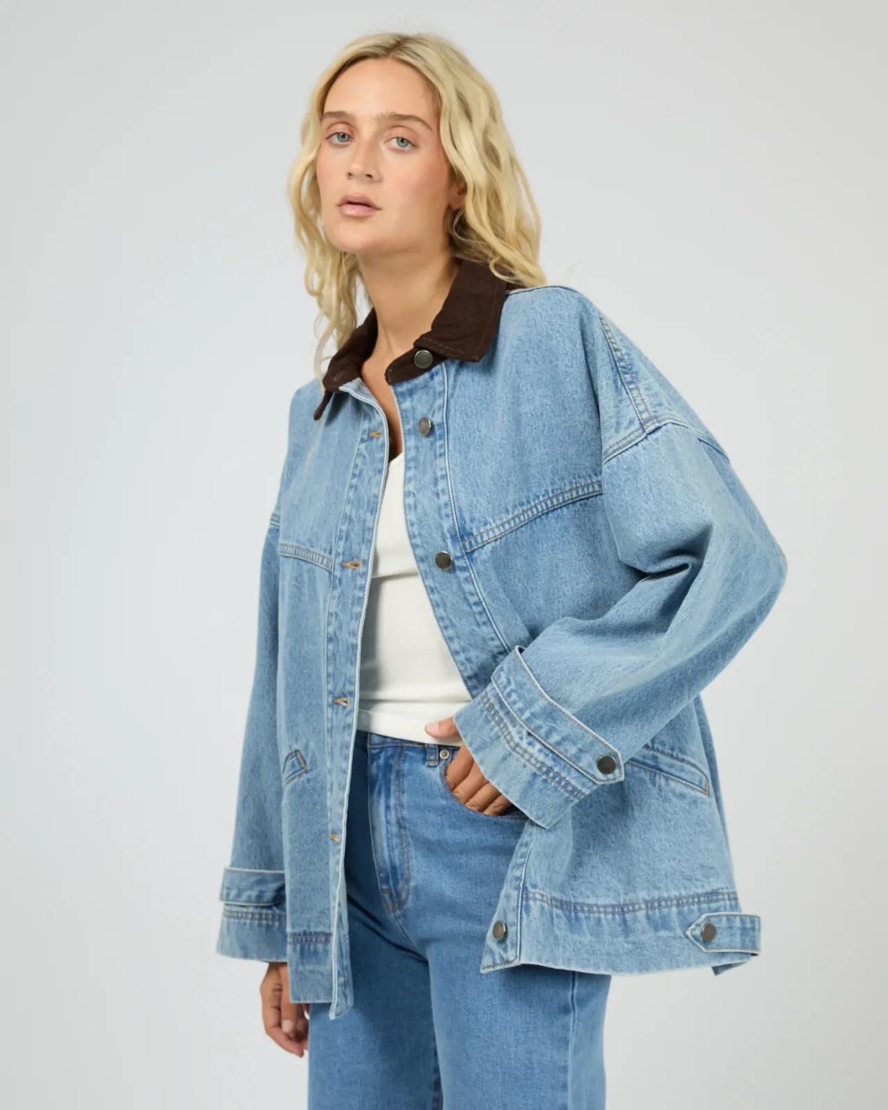 The Tommy Jacket is the ultimate transitional layer, expertly combining a vintage workwear aesthetic with a modern, oversized silhouette. In a classic light blue wash, it offers a relaxed, effortless mood that makes it an essential piece for high-rotation styling. Crafted from a premium rigid cotton denim, this shacket provides a high-quality, structured feel that is designed to last. The weighted denim ensures the piece maintains its cool, boxy shape, providing the perfect amount of substance for seasonal layering. Showcasing a bold contrast corduroy collar and polished metal hardware, it is detailed with functional front pockets for a touch of utility. Pair it back with matching denim for a coordinated look, or throw it over a basic tank and leggings for a relaxed, off-duty style.