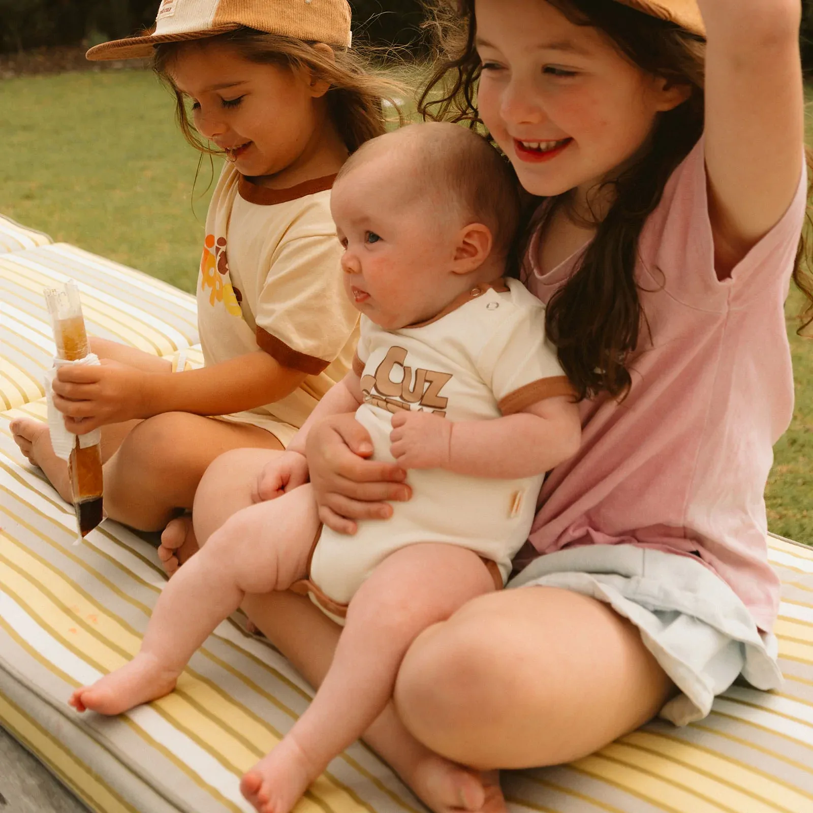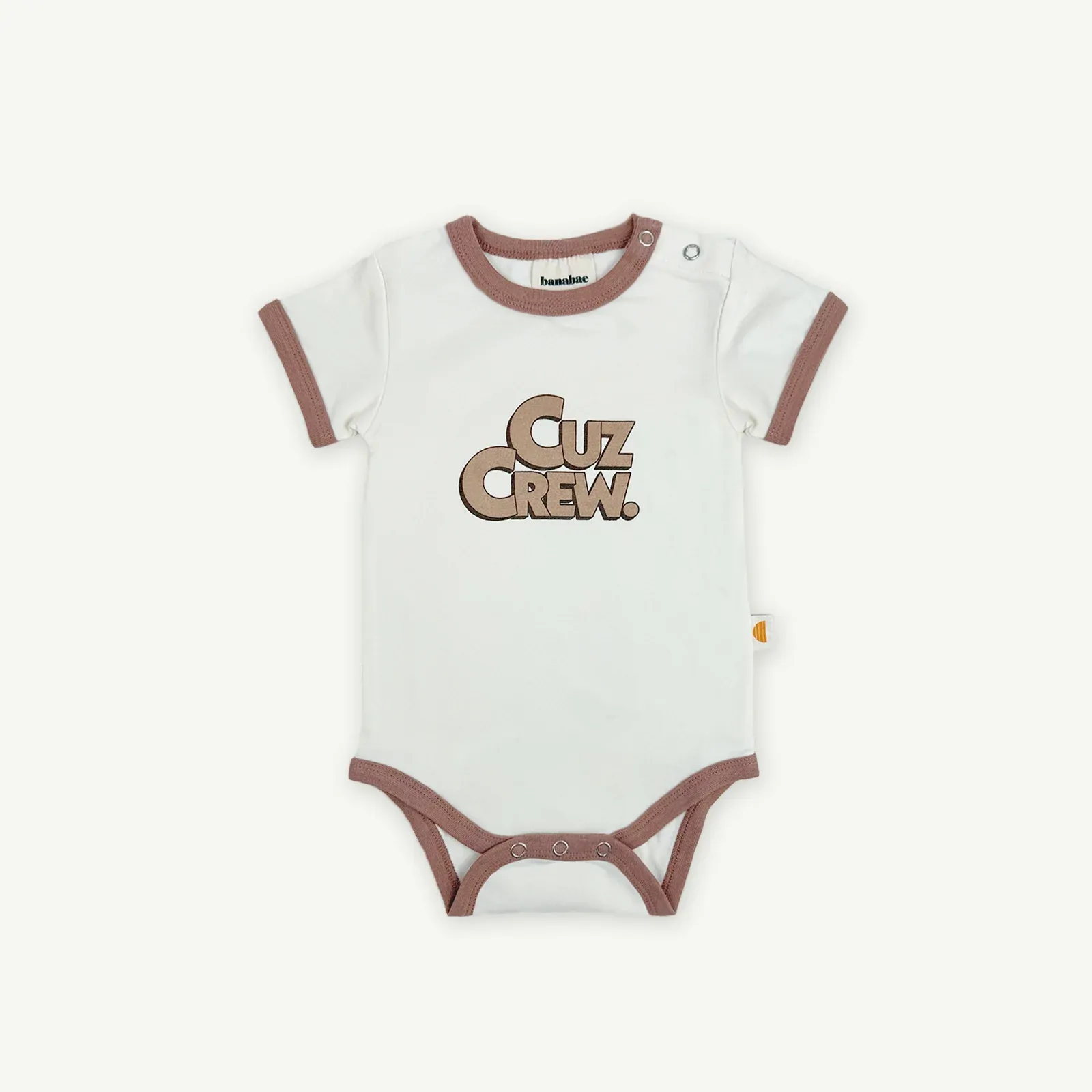 Meet the Cuz Crew Onesie in delicious Mousse shade - the perfect outfit for showing off your little newcomer and snapping that picture-perfect family moment. It's the adorable essential for making baby's grand entrance into your squad.