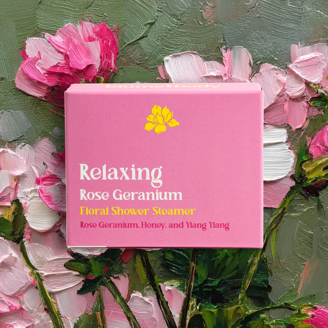 A floral and sweet aroma essential oil shower steamer with warm ROSE GERANIUM, HONEY and YLANG YLANG notes. Run a hot shower, let your shower steamer get wet, set aside while it fizzes. Breathe deep, relax and reset while the aroma lingers in the steam. Reposition as needed for best results.