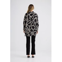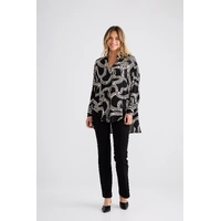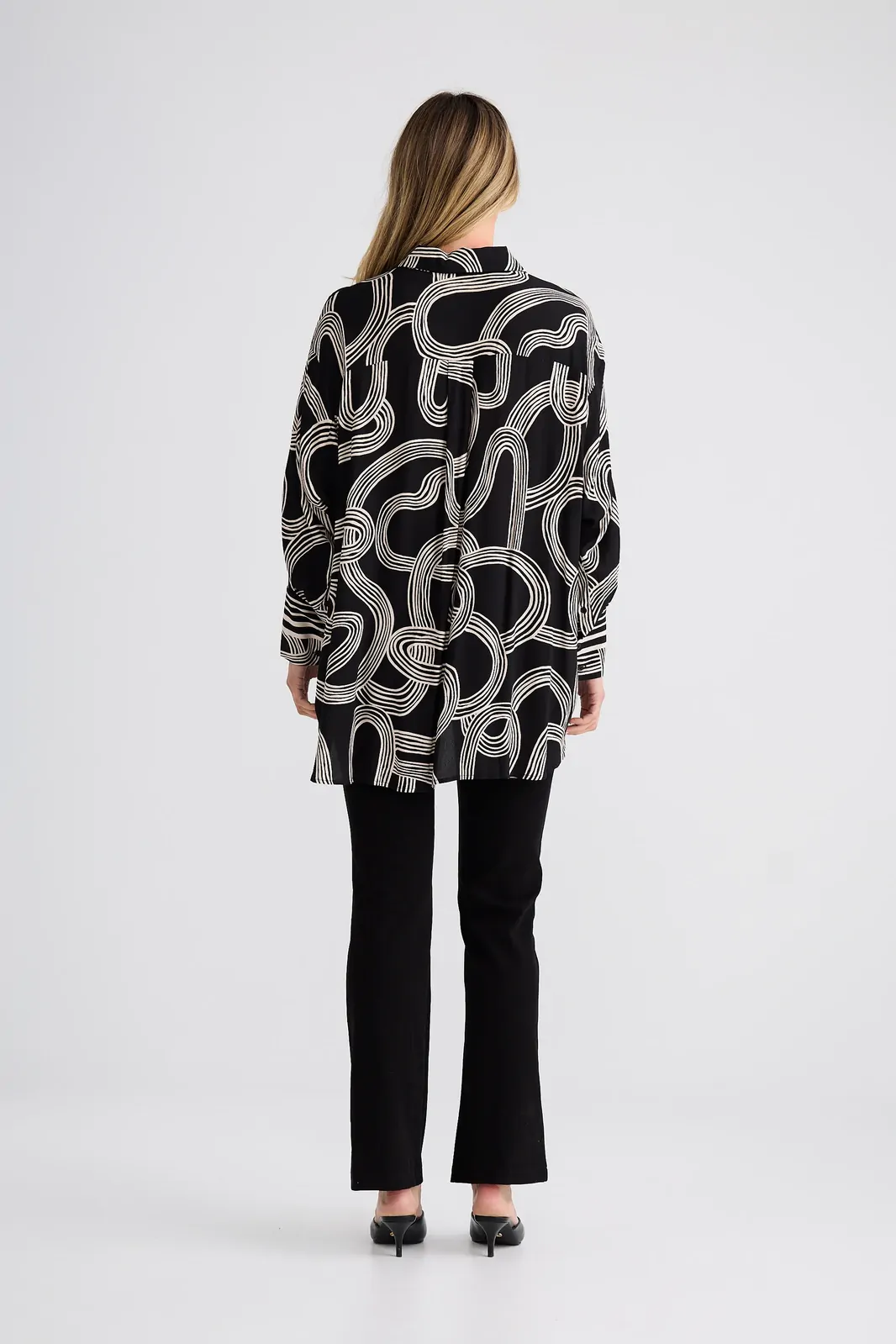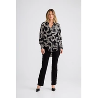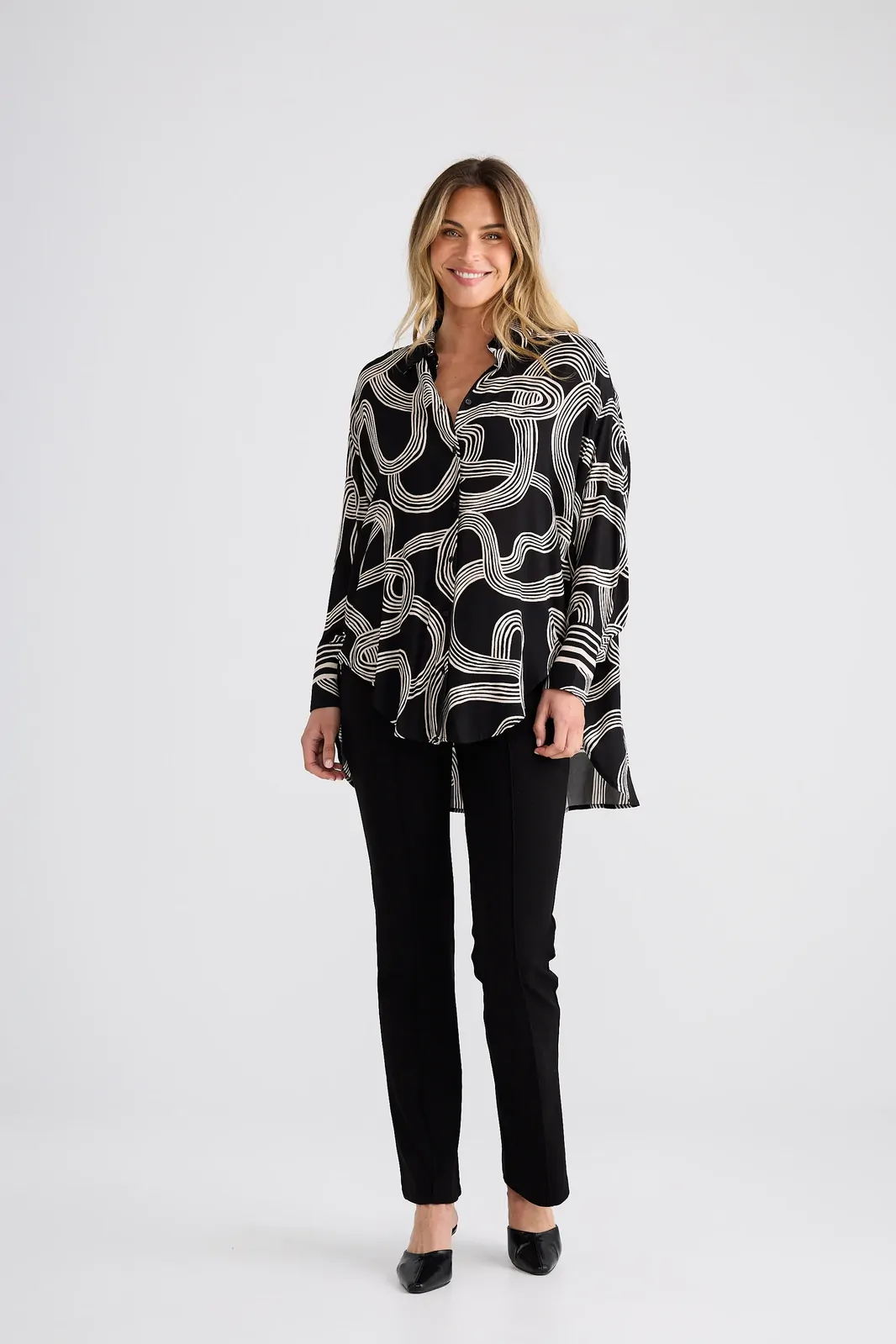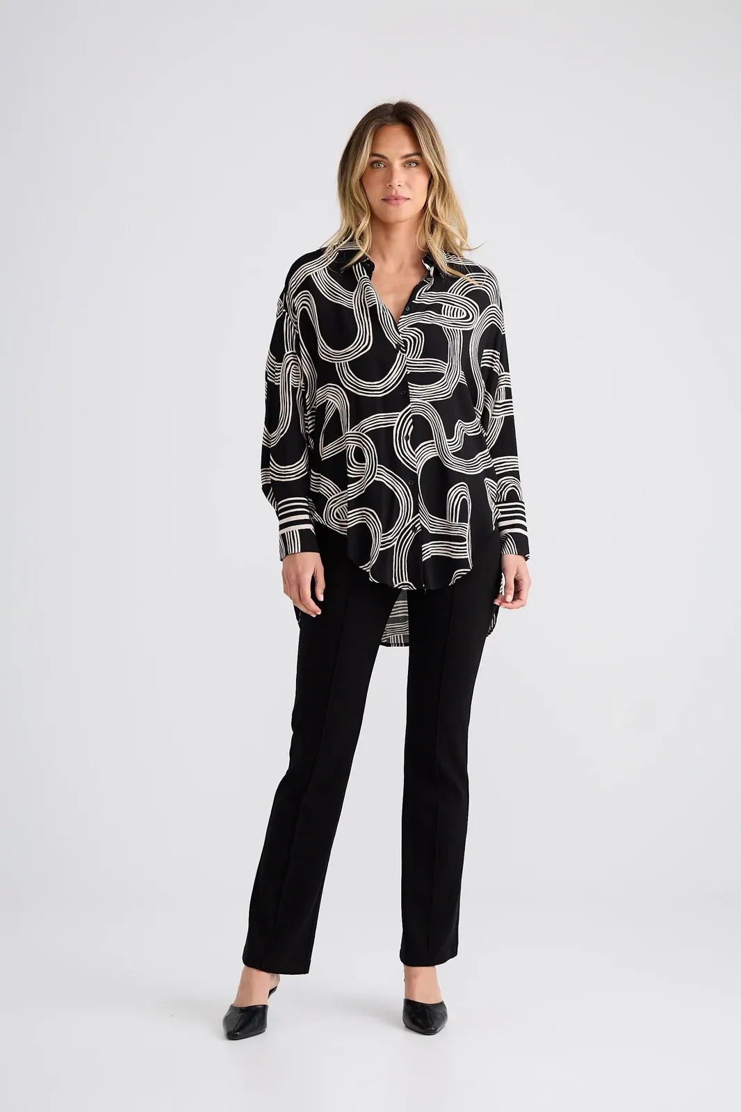 The Homestead Shirt is an elevated wardrobe staple designed with a relaxed, oversized silhouette for effortless styling. Featuring a classic collared neckline and button-up front, this piece balances structure with fluid drape. Long sleeves are finished with wide cuffs, while the high-low scoop hemline adds modern shape and versatility. Perfect for layering or wearing loose, this shirt transitions seamlessly from everyday wear to polished looks.
