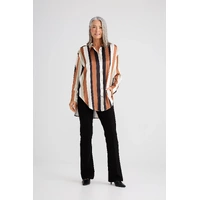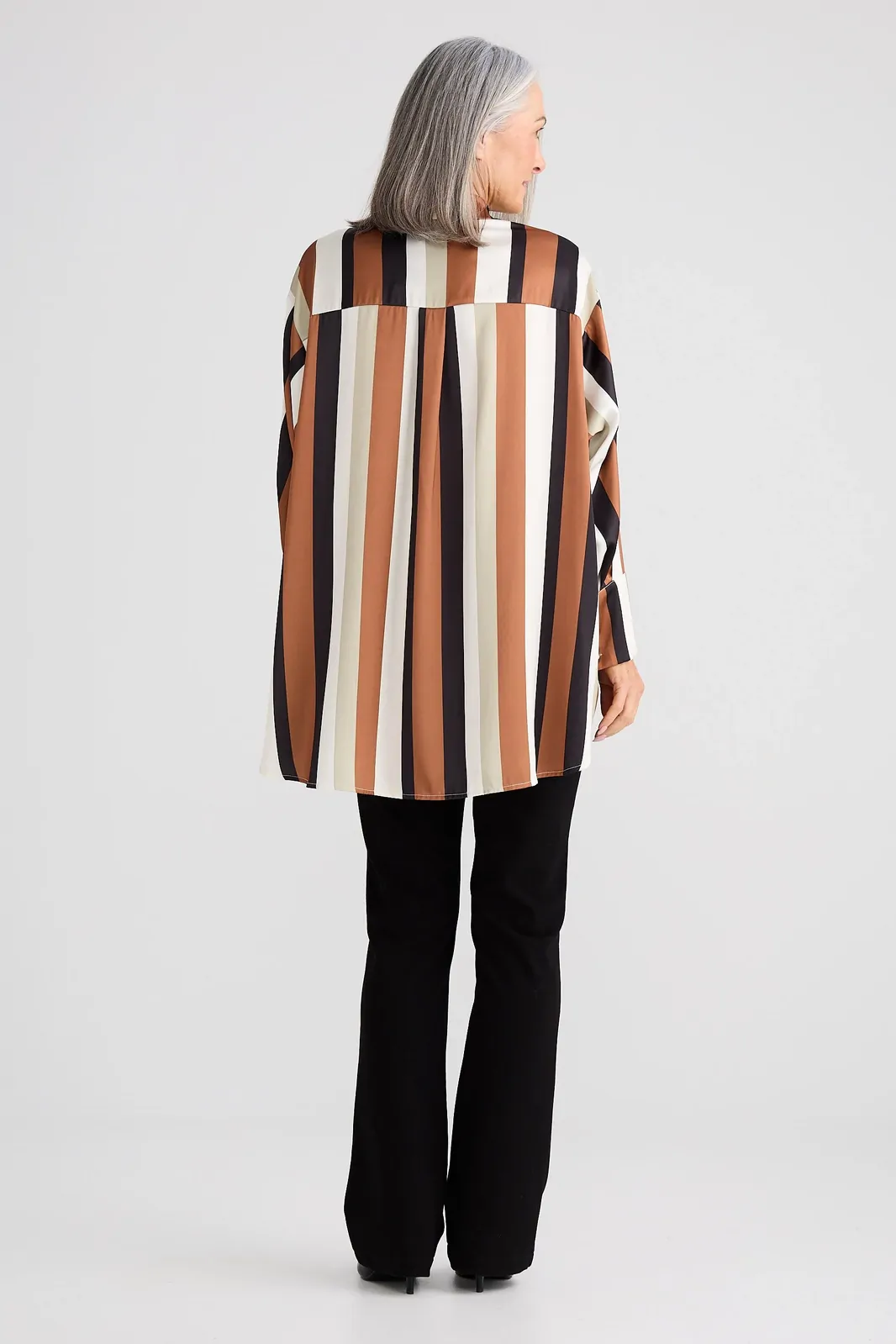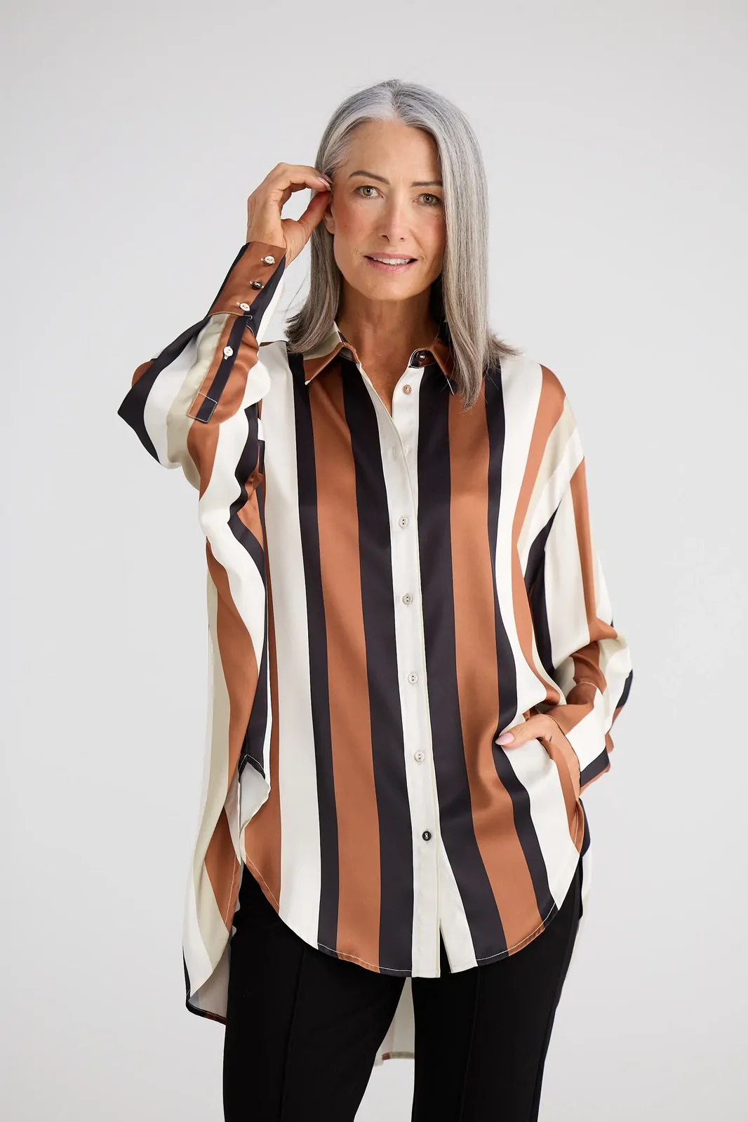 The Homestead Shirt is an elevated wardrobe staple designed with a relaxed, oversized silhouette for effortless styling. Featuring a classic collared neckline and button-up front, this piece balances structure with fluid drape. Long sleeves are finished with wide cuffs, while the high-low scoop hemline adds modern shape and versatility. Perfect for layering or wearing loose, this shirt transitions seamlessly from everyday wear to polished looks.