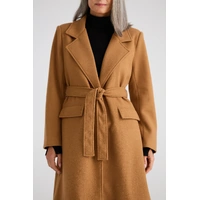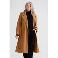 The Julianne Coat is a timeless, tailored outerwear piece designed to elevate cooler-weather styling. Cut to a flattering knee length, this fitted coat features a classic open lapel collar and a removable waist belt to define the silhouette. Clean welt hip pockets add functionality while maintaining a streamlined finish. Crafted in a warm camel tone, it layers effortlessly over knits or tailoring for a polished, refined look.