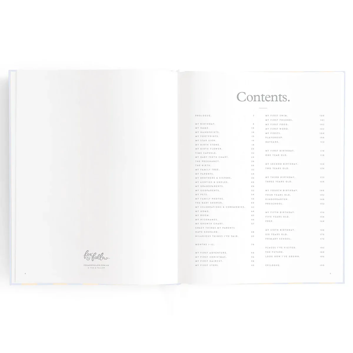 A beautiful keepsake for the whole family to enjoy. Includes: important milestones and firsts, family profiles, family tree and travel map, playgroup and daycare through to kindy and school years, time capsule, nicknames and celebrations, pets, friends, birthdays and more.