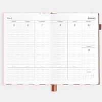 208 pages. One week per spread and monthly spreads at the beginning of each section. Gold foil stamped linen cover with gold foil edging. Three grosgrain ribbons in rust, blush and cream.