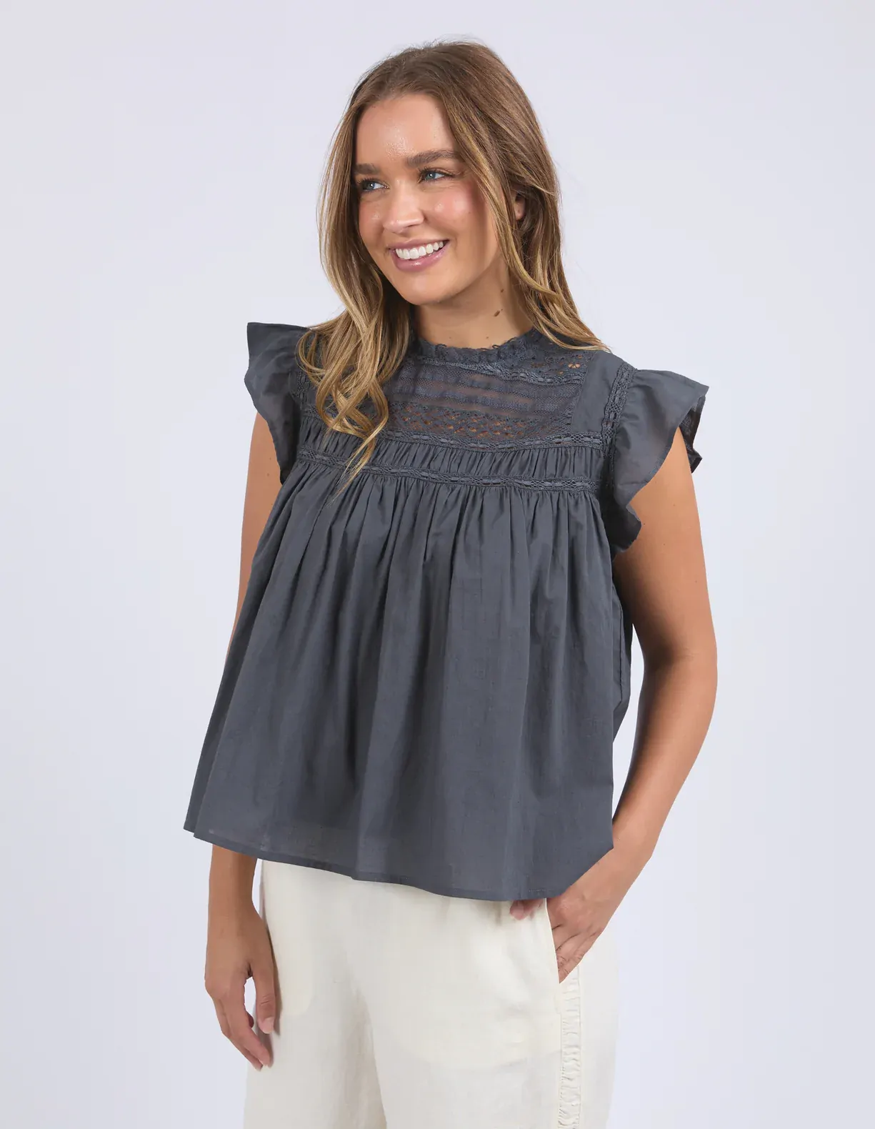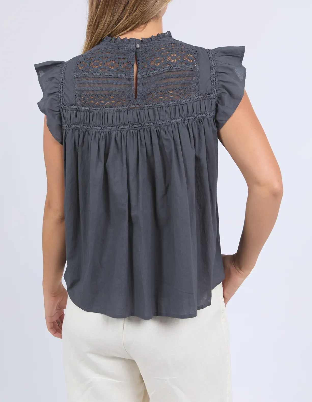 Flirty and feminine with all the details you’ll love. The Adelyn Top features delicate lace trim, playful sleeve frills, and a sweet back keyhole with button closure. Made from soft 100% cotton, it’s lightweight and breathable for easy everyday style with a touch of charm.