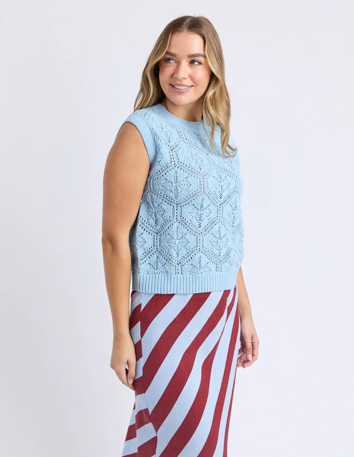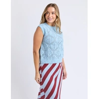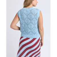 Crochet all the way! The ultimate in seasonal style the Luna Knit Vest is a cute pointelle sleeveless knit in cool vintage white that will look great atop any of your stylish bottoms.