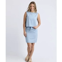 Comfort and style with this little denim skirt. With a super stretchy fit and drawcord for cinching in at the waist, this is the best little denim skirt you'll ever wear!