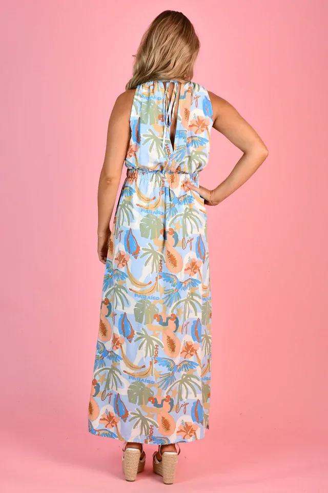 The Honeymoon Maxi Dress features a delicate palm leaf print in soft tones, a flattering V-neckline, and a rouched waist. The back has a stylish tie detail and a subtle cut-out. Made from lightweight fabric, this flowing maxi dress is perfect for a romantic getaway or a casual summer outing.