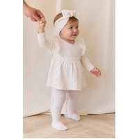 A beautifully elegant piece for your little one, the Vivienne Playsuit in Aries Mauve features long sleeves, delicate ruffle detailing along the shoulders and chest, and a soft integrated nappy cover for comfort and practicality. The gentle mauve tone is adorned with a subtle floral pattern, making it a charming choice for everyday wear or special occasions.