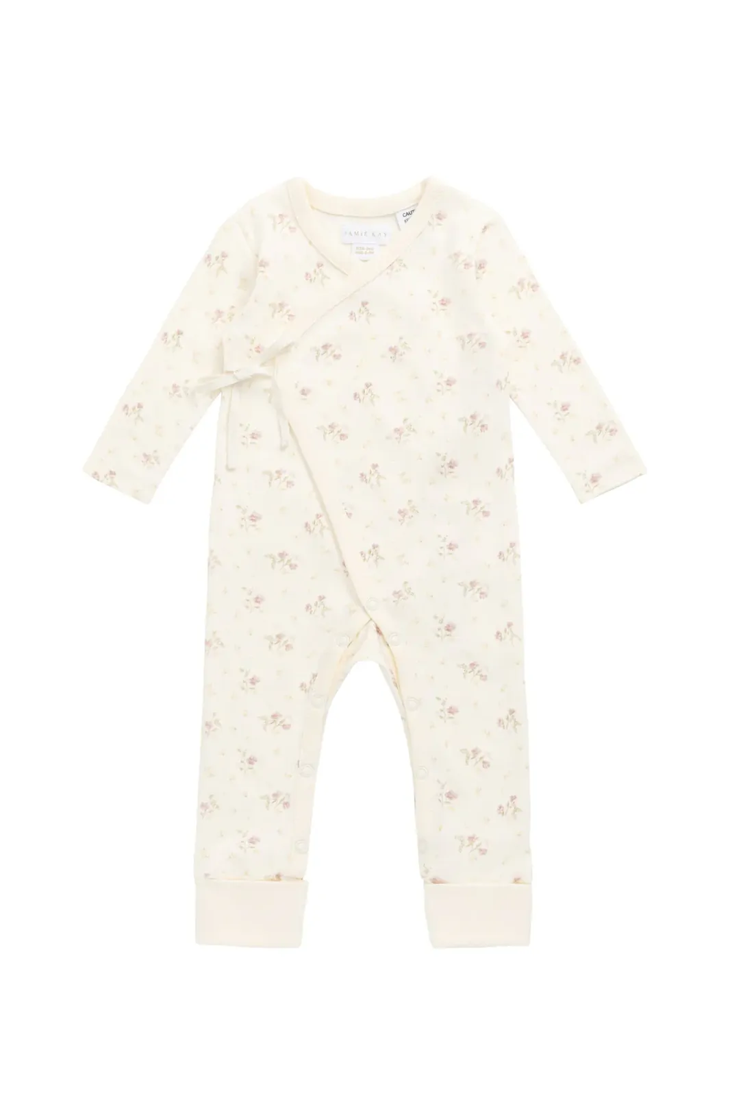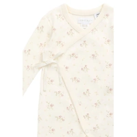 Introducing the Organic Cotton Estelle Onepiece – Thelma Parchment, a beautifully soft cream-colored baby onesie adorned with a dainty floral print. Featuring a wrap-style front and snap buttons along the side and legs, this piece is thoughtfully designed for easy changing and all-day comfort.