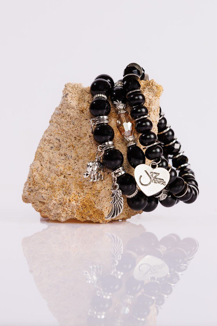 Introducing the Amelia bracelet, a sleek and edgy design that perfectly captures Amelia’s bold, vibrant personality. This bracelet is all about black—her favorite color to wear—accented with silver embellishments that give it a cool, modern feel. The bracelet features three meaningful charms: an elephant, a love heart, and a wing, each symbolizing wisdom, love, and freedom. A heart pendant engraved with the Jaz Flowers logo adds the final touch, symbolizing the connection you share.