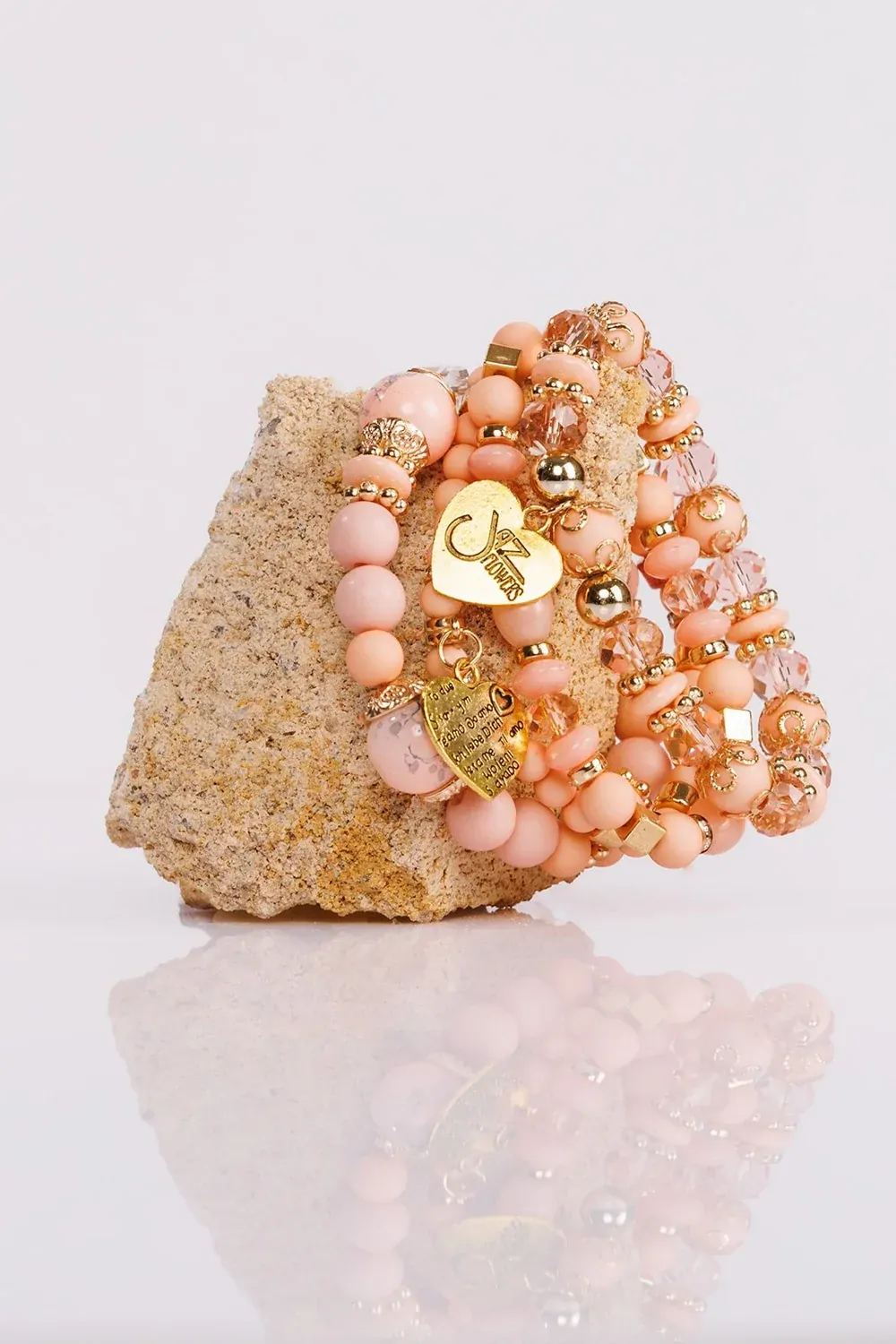 Introducing the Bunji Stretchy Doodah Stack , a soft and elegant blend of apricot and peachy pink tones that exude warmth, grace, and beauty—just like the incredible woman it’s named after. With matte and shiny beads that feature crystal and marbled effects, this bracelet is a true reflection of Bunji’s understated elegance. Gold and tiny diamanté accents throughout the piece add a touch of luxury, and two gold heart pendants—one with the Jaz Flowers logo—symbolize the strong and enduring friendship you share.