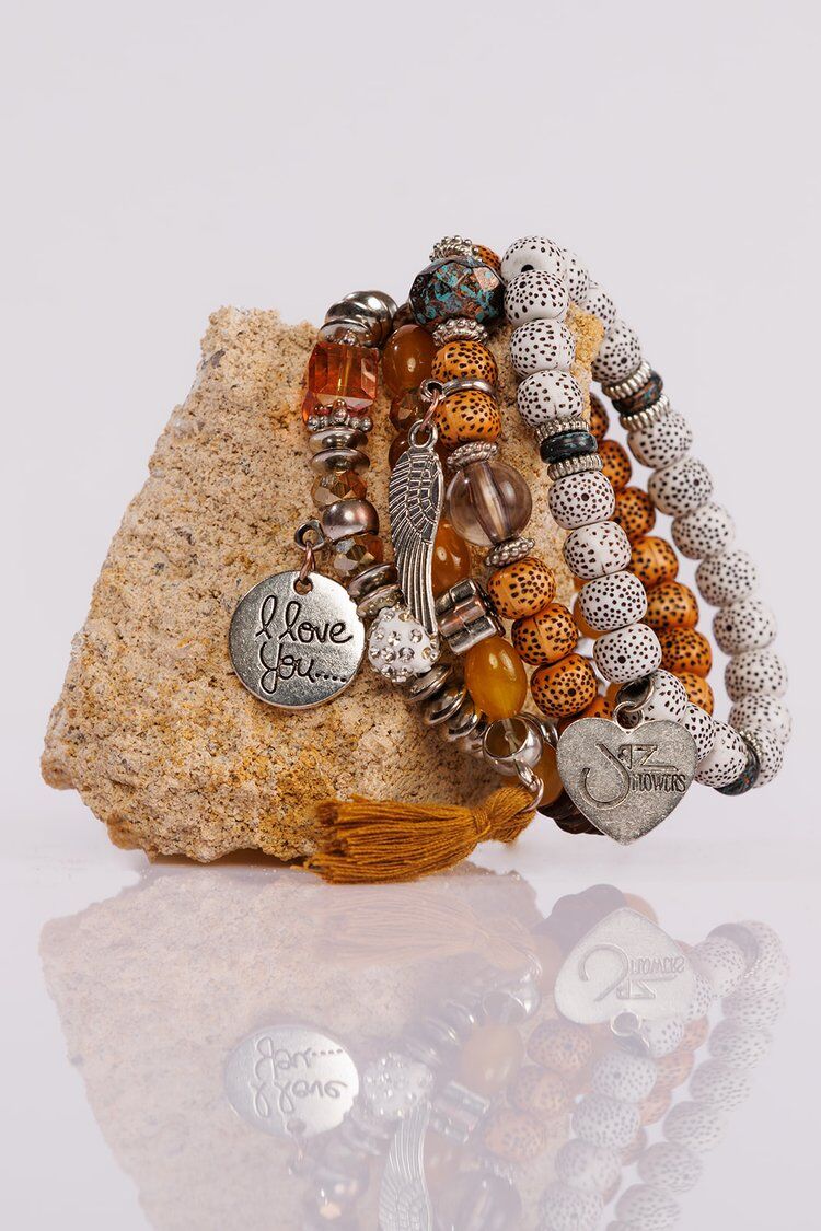 The Emily bracelet is white with silver accents, effortless and easy—just like her. Warm tan beads give it a cozy, earthy feel, while little flower beads add a soft touch. There are tiny diamantés for a bit of sparkle, plus textured speckled beads and a marbled bead with a hint of turquoise gemstone effect to keep things interesting.