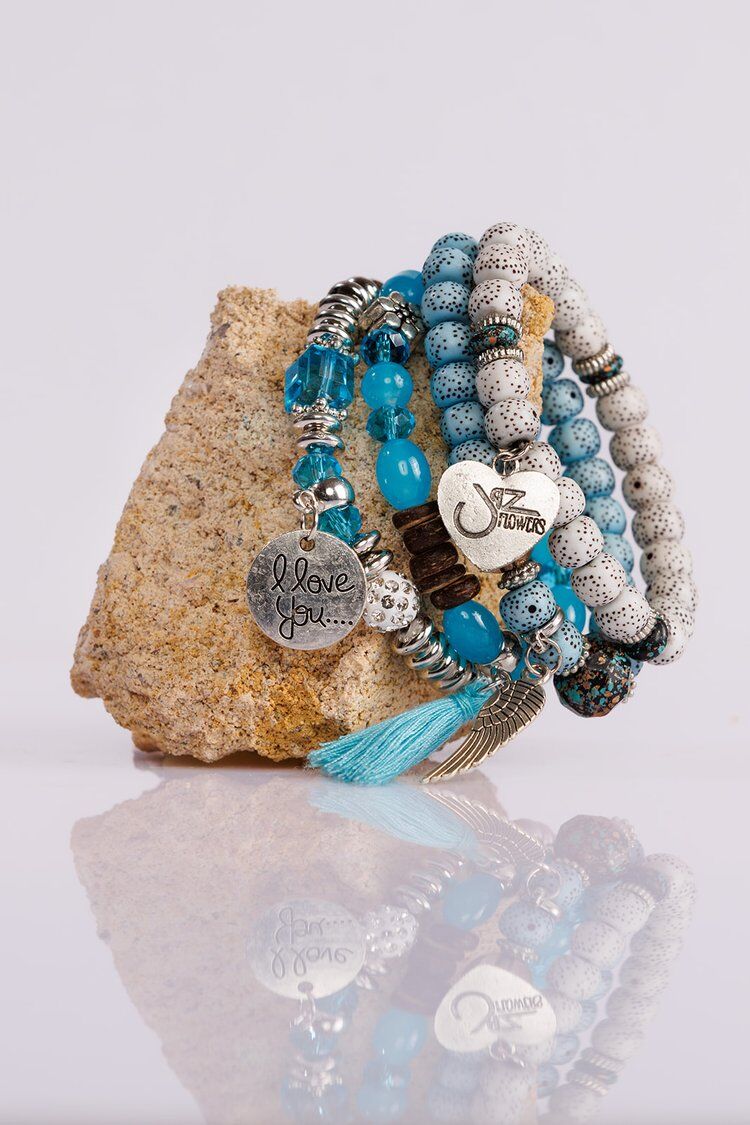Drenched in soft, sky-blue tones, this bracelet features a mesmerizing mix of white and blue speckled beads, faceted crystal-like accents, and gemstone-inspired details that catch the light with every move. Silver embellishments weave through the design, adding a sleek contrast and an extra dose of elegance.