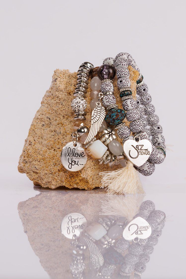 Designed in soft white tones, this bracelet is a reflection of Roo’s pure, luminous spirit. Silver elements thread through the design, alongside natural wooden beads that speak to her love for all things unique and unconventional. Tiny diamantés add a gentle sparkle, mirroring the light she carried with her wherever she went. Turquoise marbled gemstone-inspired beads bring a subtle pop of color, symbolizing the depth and vibrance she brought into every space.
