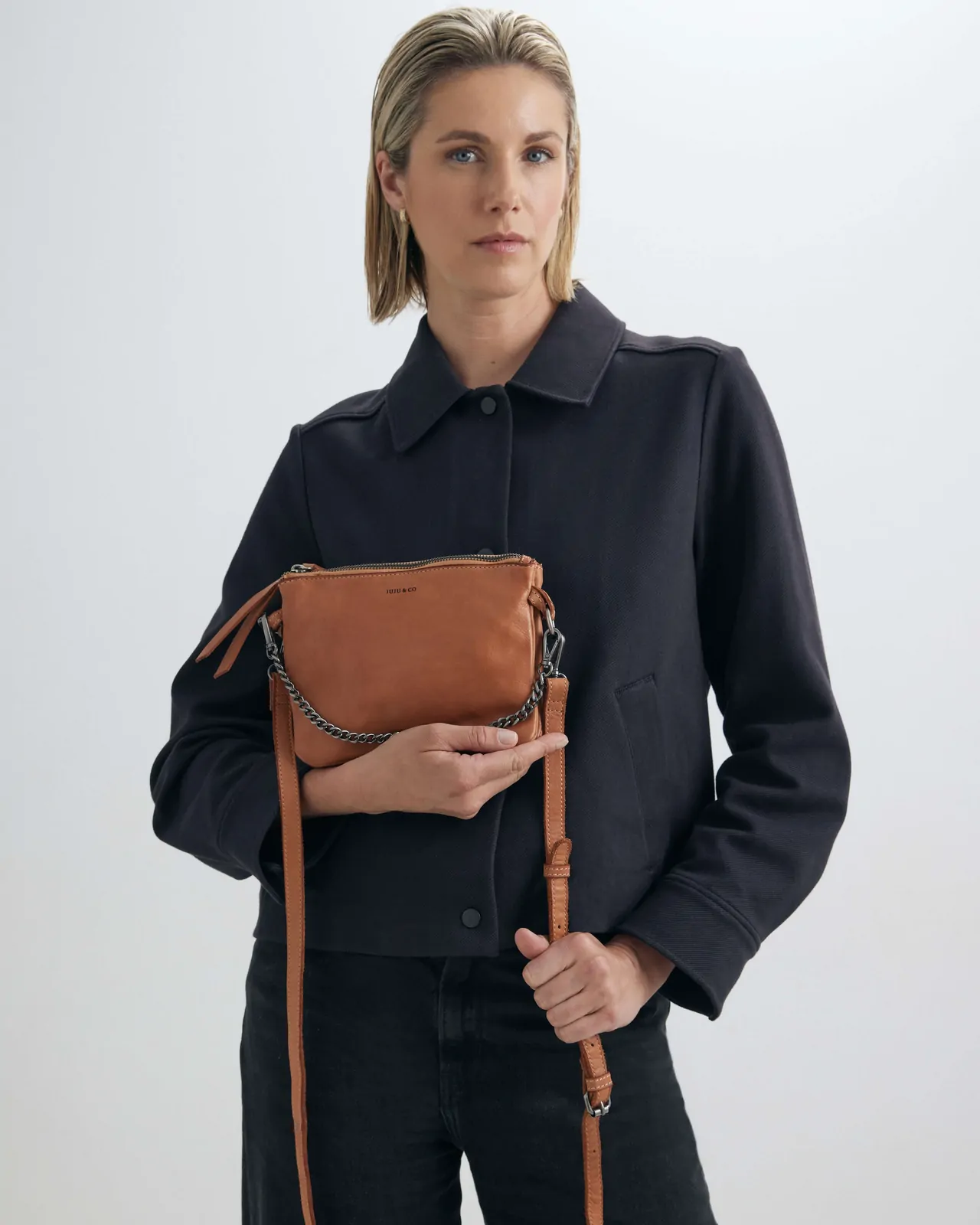 - Adjustable and detachable leather crossbody strap