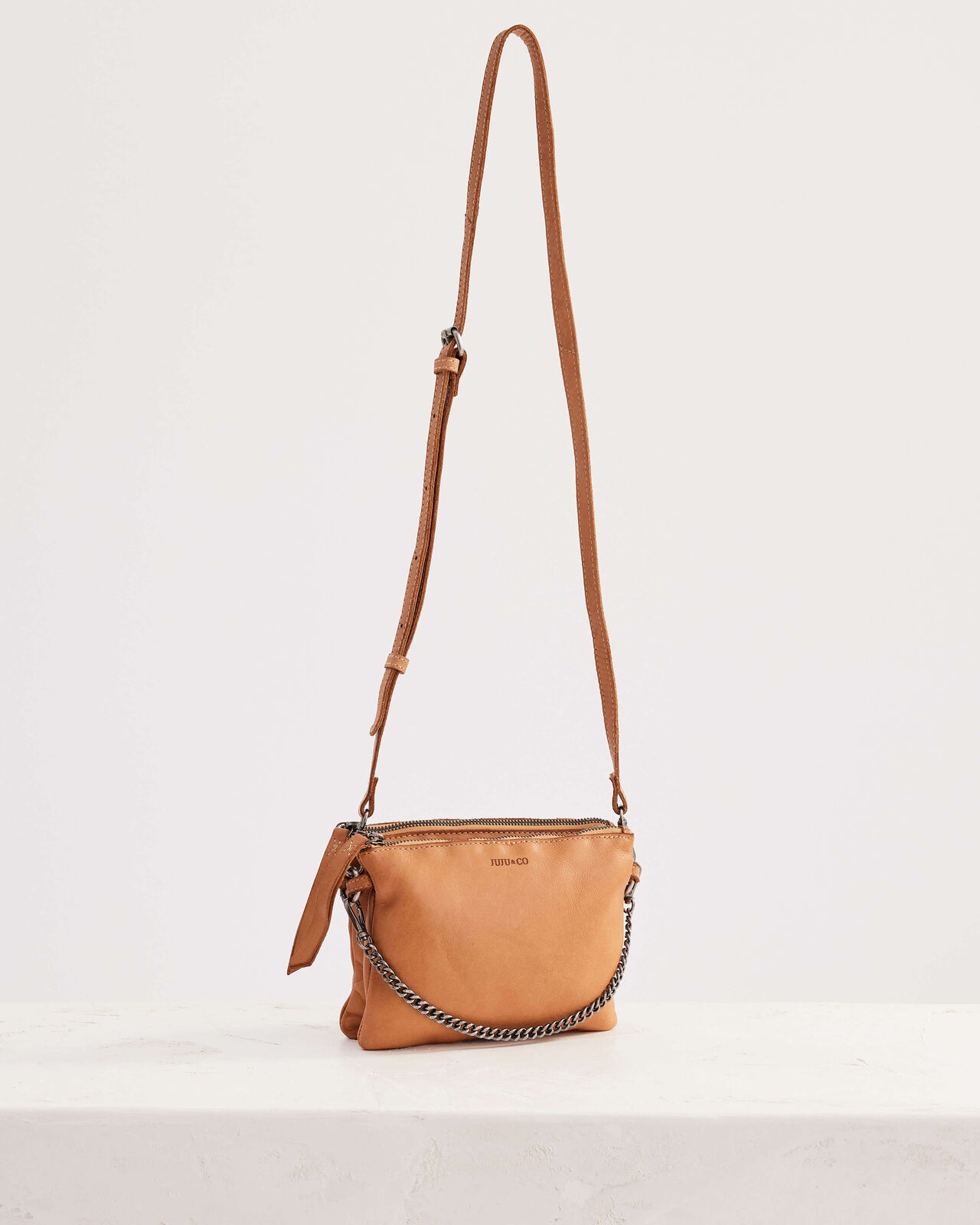 The Good Juju is a crossbody bag made from washed leather. With a detachable chain and double bodied construction, style for day or night with ease.