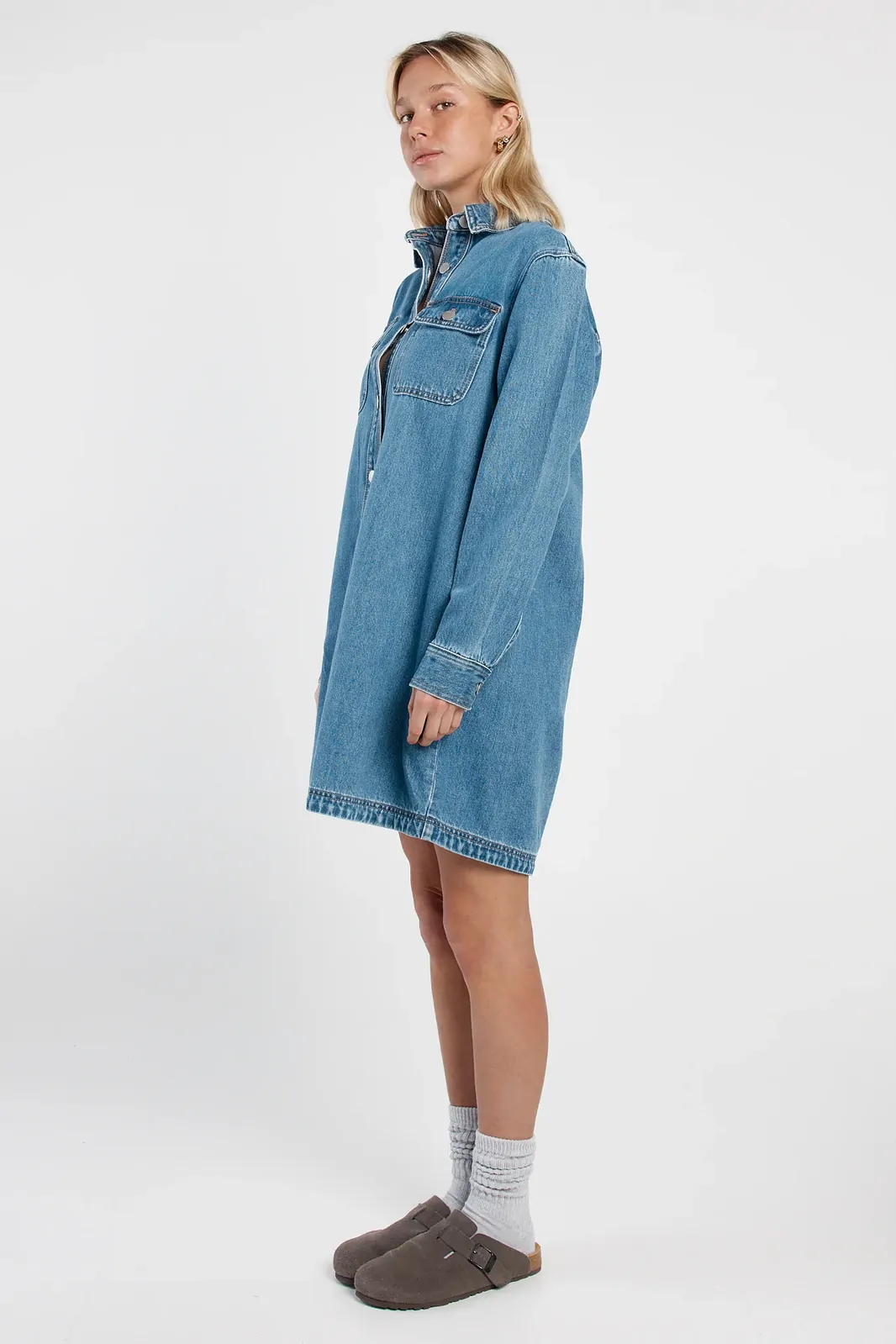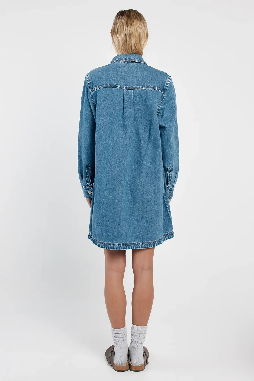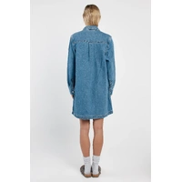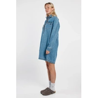 The Aveline Denim Shirt Dress combines classic shirt styling with an easy mini dress silhouette. Designed with functional chest pockets and branded silver buttons, it offers a timeless denim look with everyday comfort. The straight hem keeps the look clean and versatile, making it perfect for casual styling across seasons.
