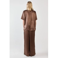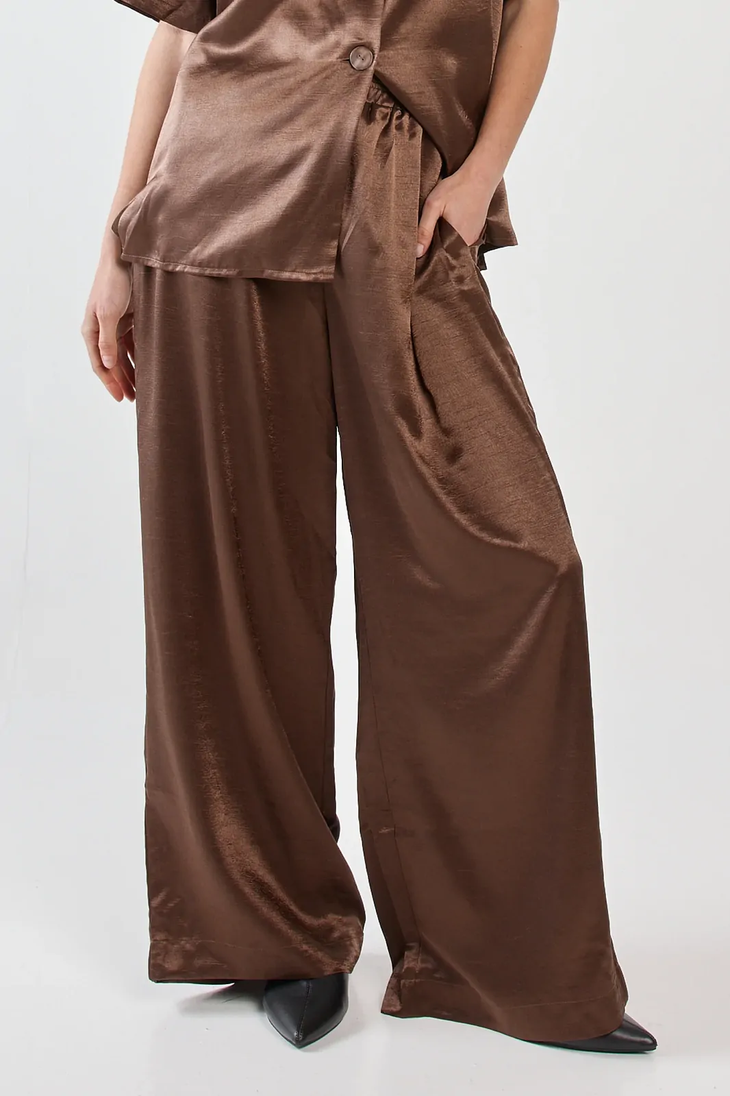 The Eddy Crushed Satin Pant is fluid, effortless and quietly elevated. Crafted in soft crushed satin, it moves with ease while maintaining a polished silhouette. The wide leg and elastic waistband balance comfort with on-trend appeal. A trans-seasonal statement designed for day-to-night wear.