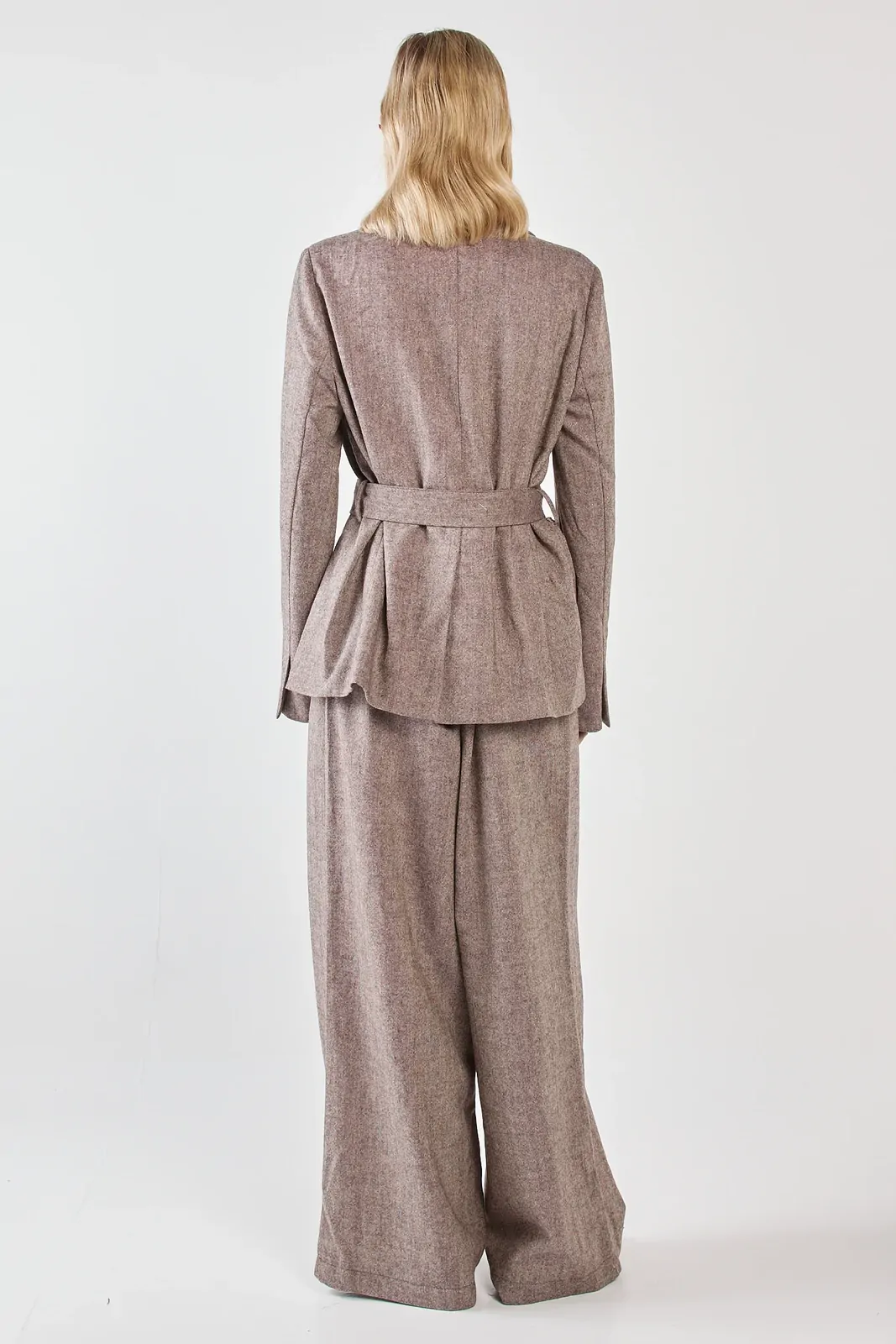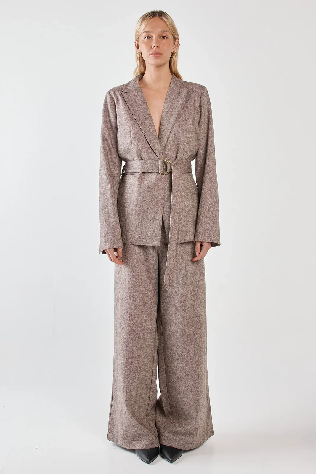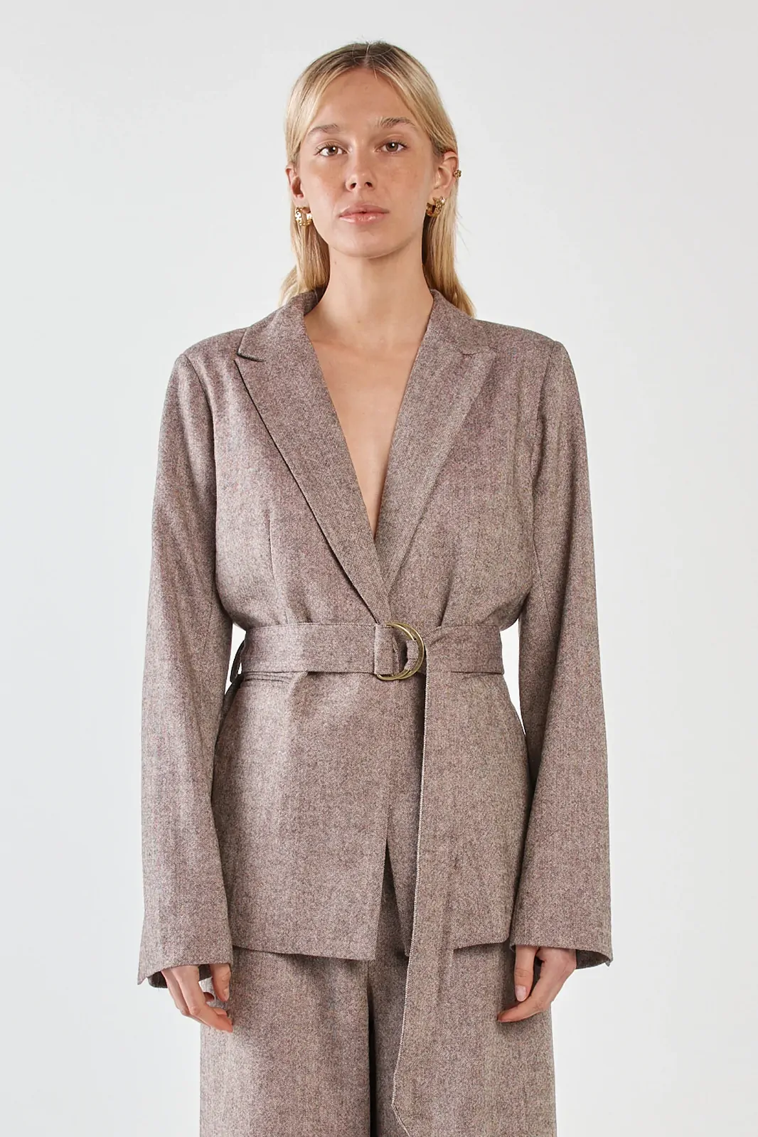 The Thalia Belted Blazer is tailored sophistication with modern edge. A self-fabric belt with brass D-ring defines the waist while maintaining polish. Crafted in a wool blend, it delivers structure with effortless wearability. A trans-seasonal statement for elevated styling.