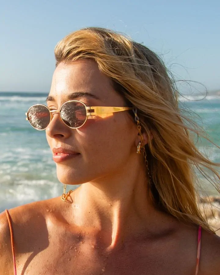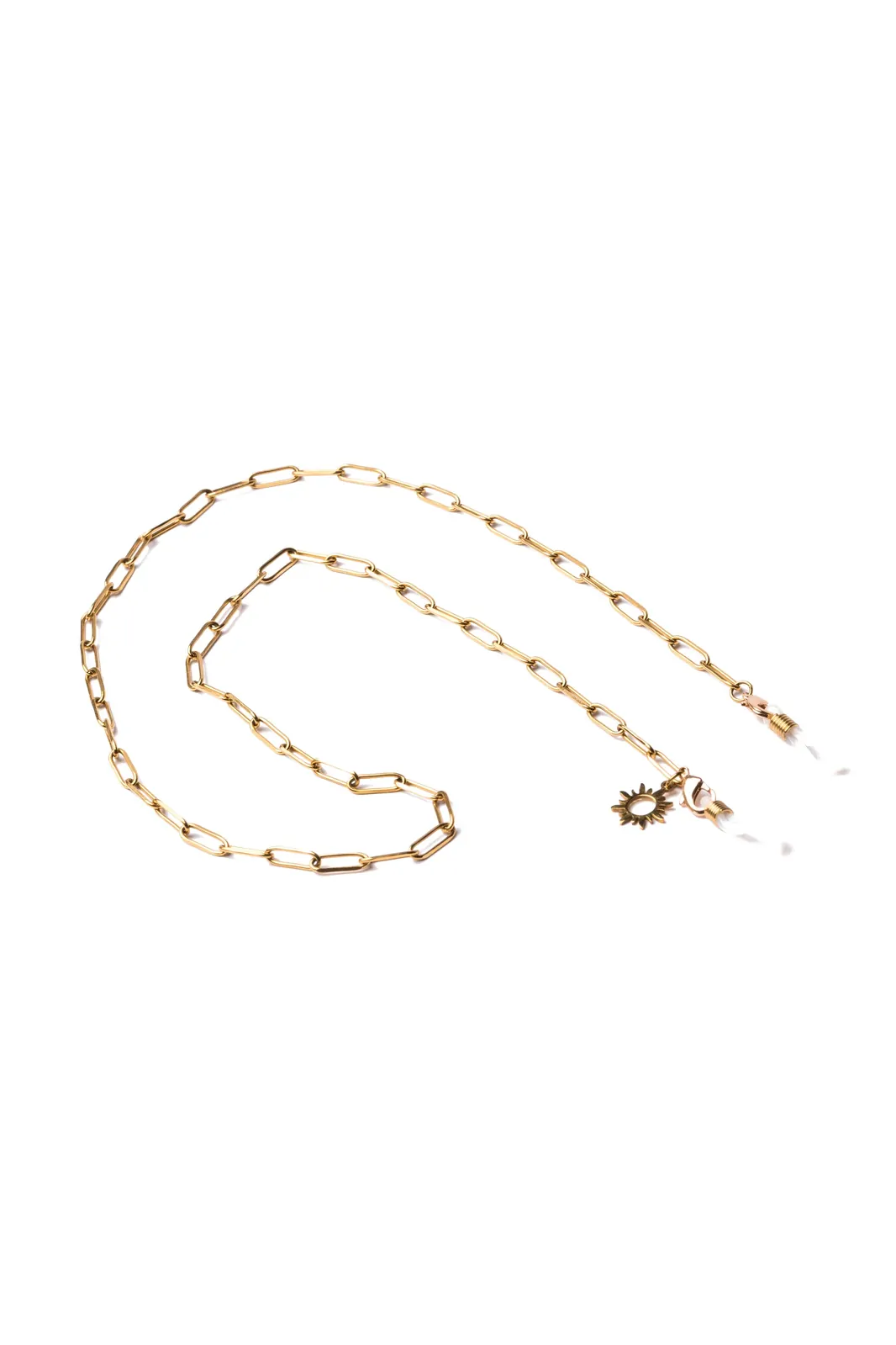 Effortlessly chic, the Gold Paperclip Eyewear Chain features trendy paperclip links adorned with a radiant sun charm. Its minimalist yet bold design makes it an essential accessory for adding a golden glow to any outfit while keeping your sunglasses secure.