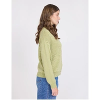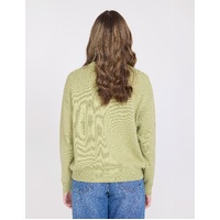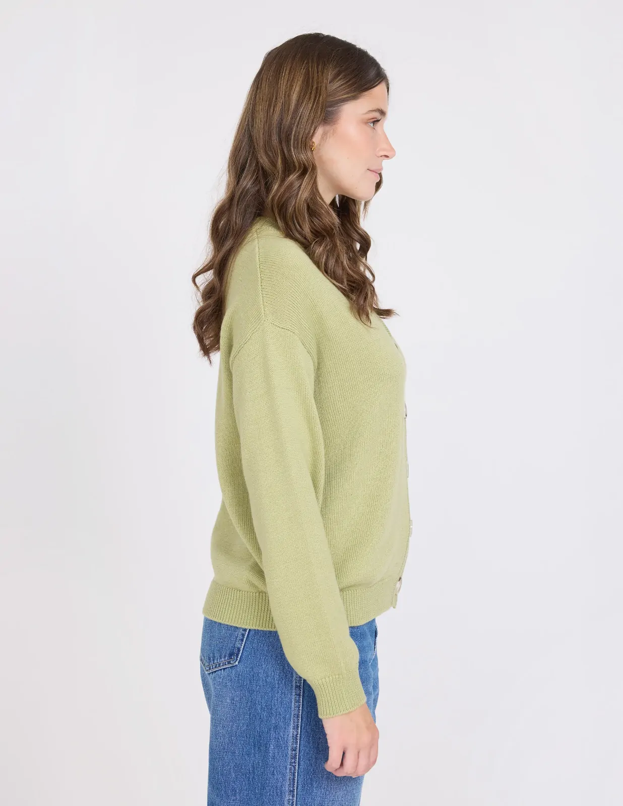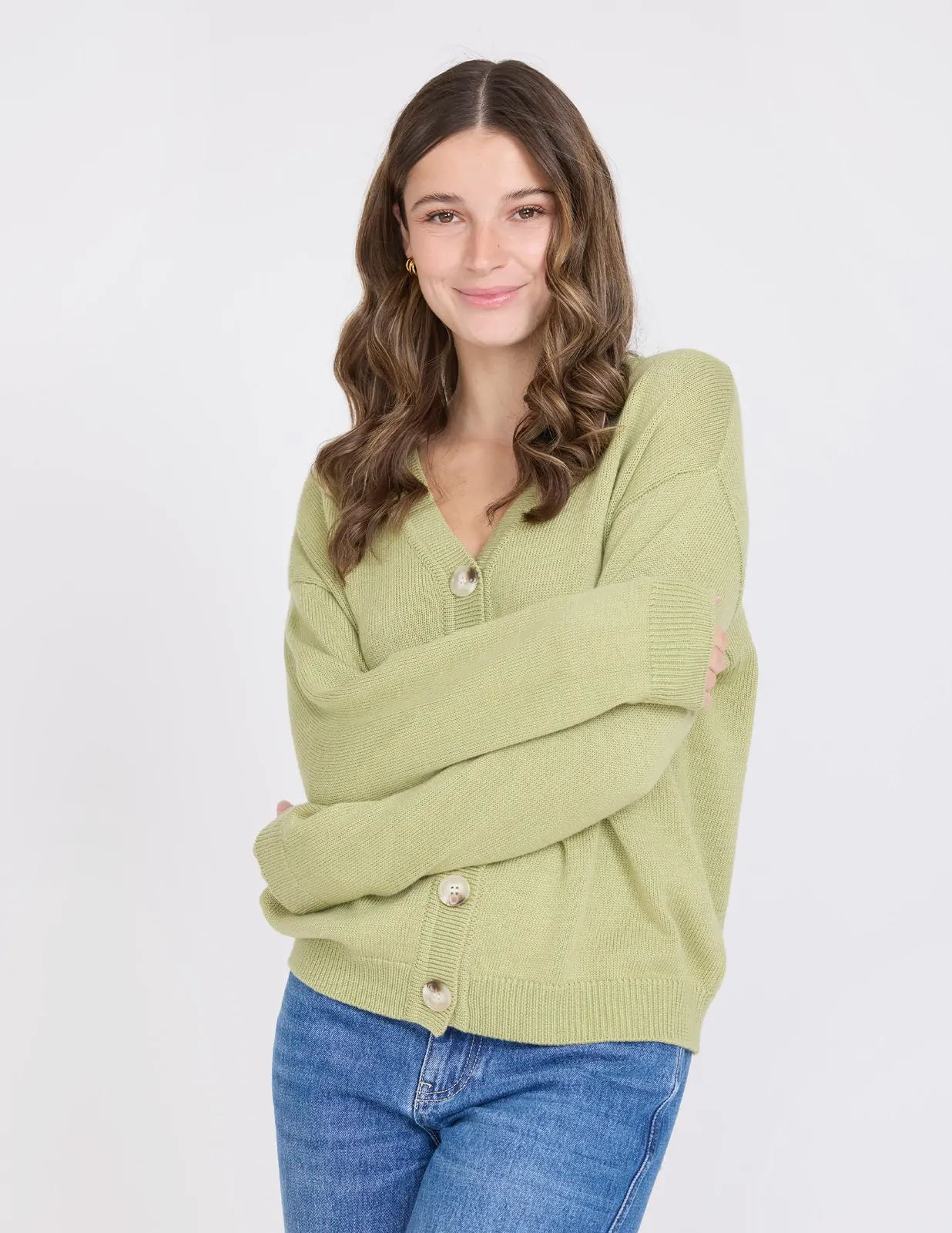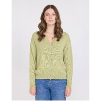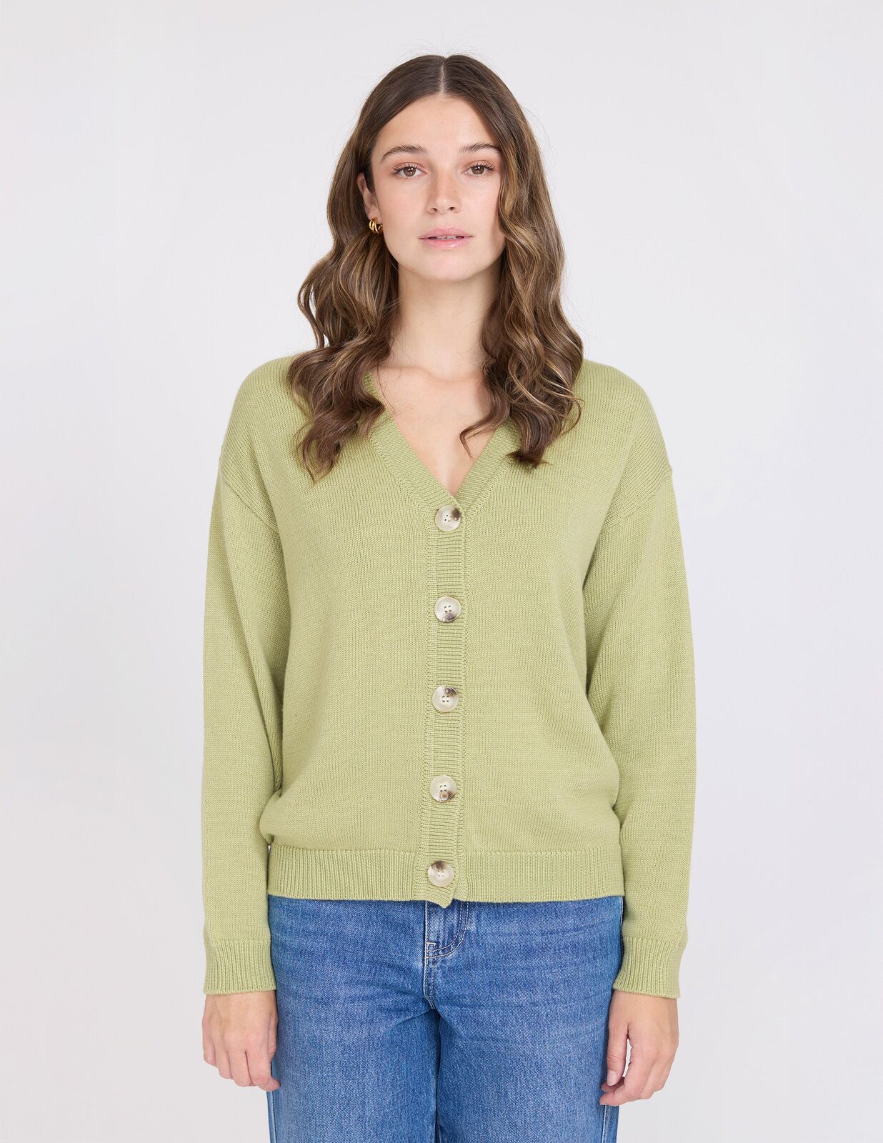 V neck relaxed fit cardigan with rib trims on cuff and hem and contrast buttons.