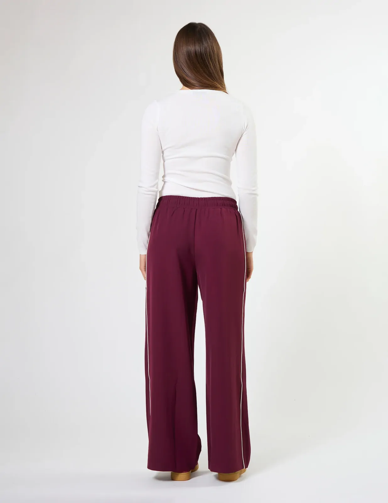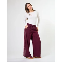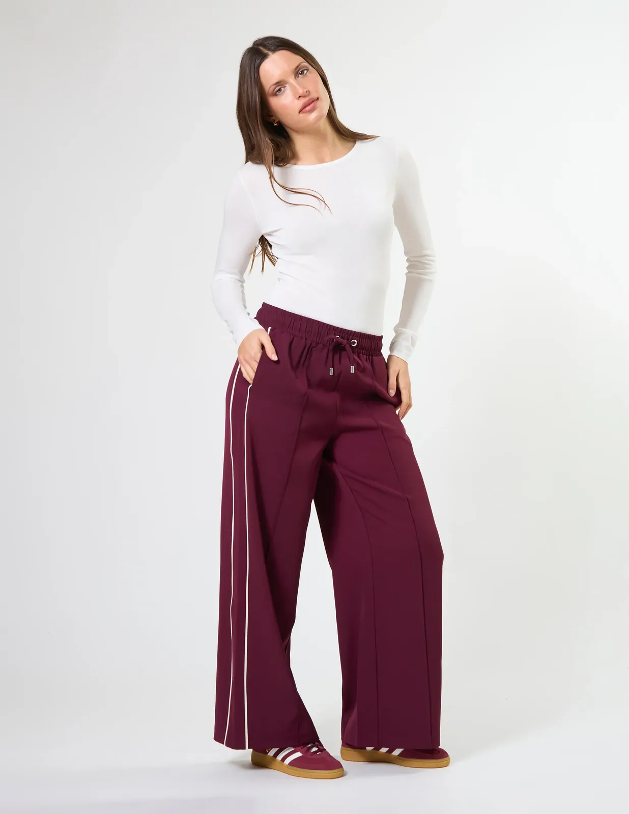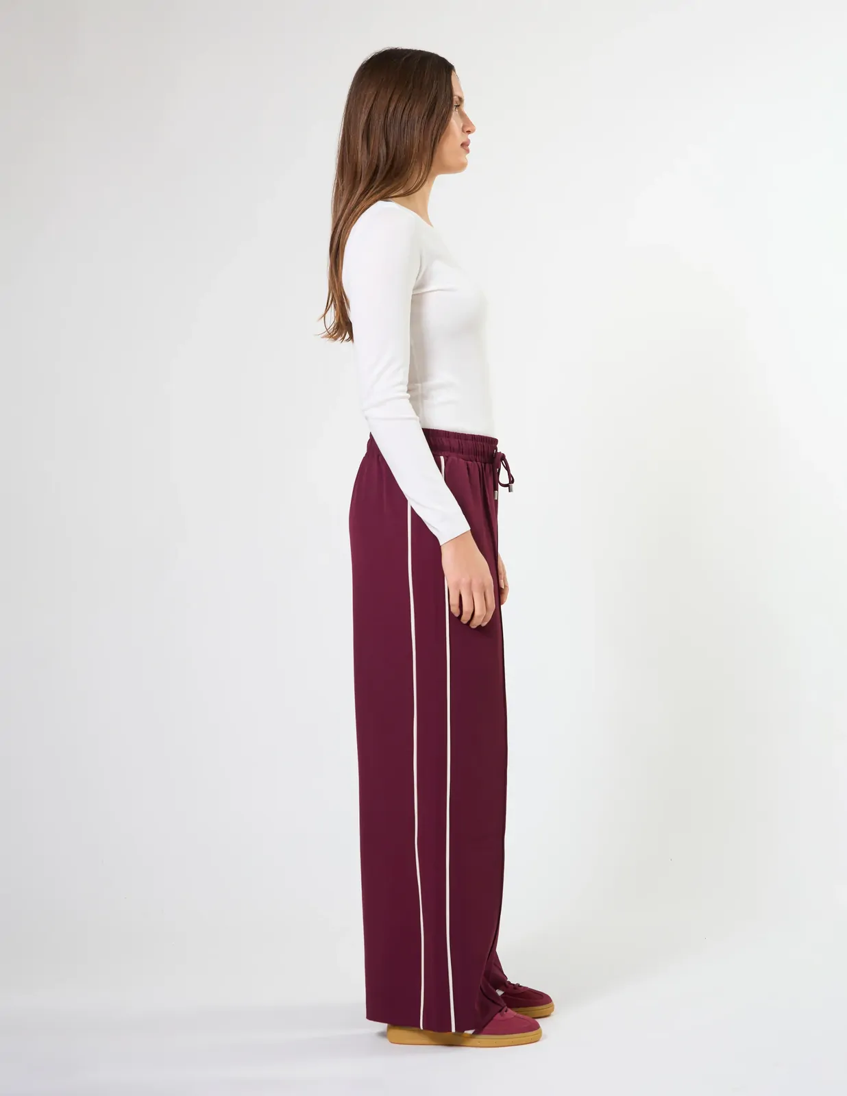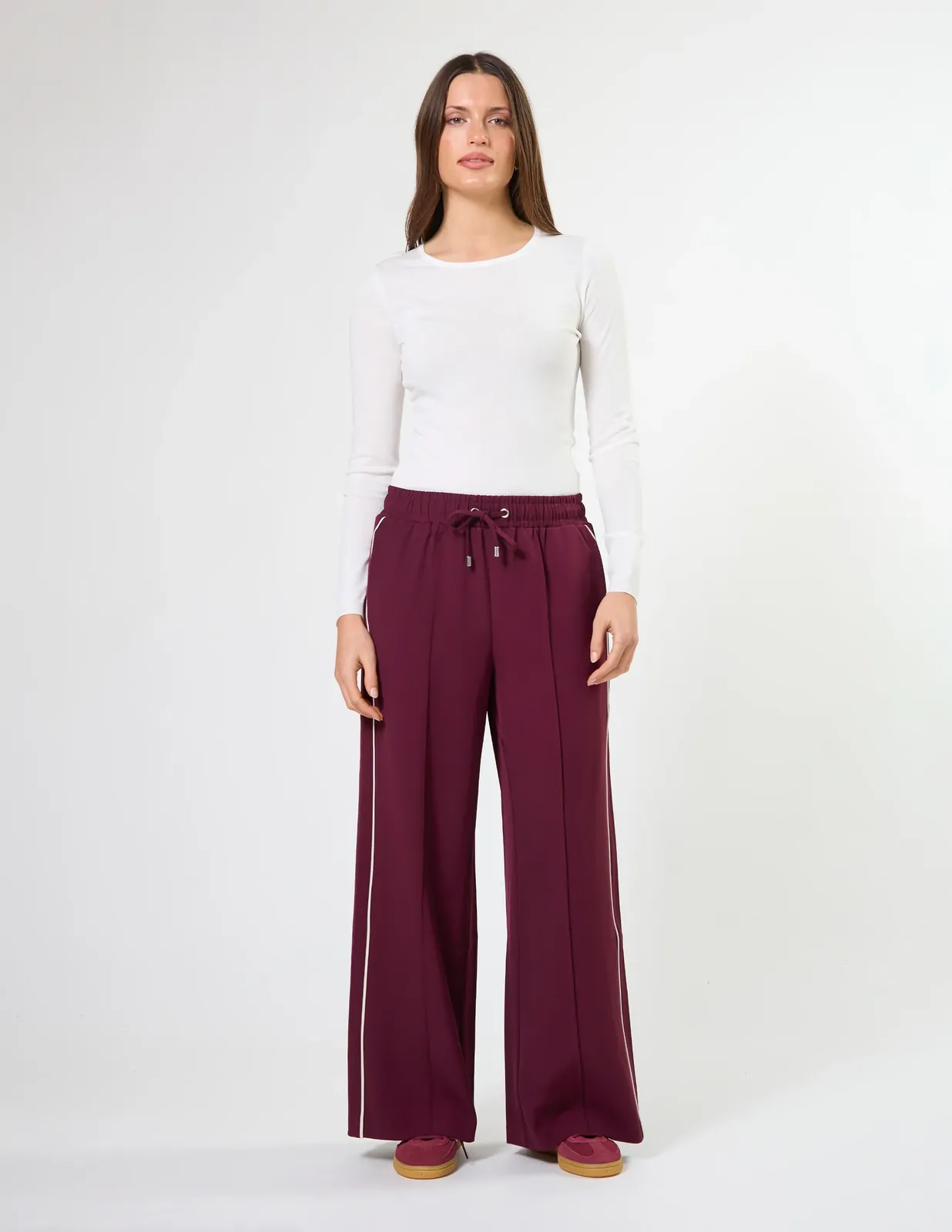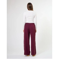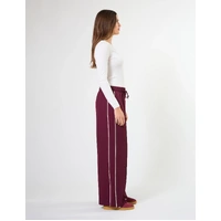Elasticated waist pant with centre front pintuck down legs, metal eyelets & self fabric tie with metal tips. Contrast colour flat pipe down side legs.