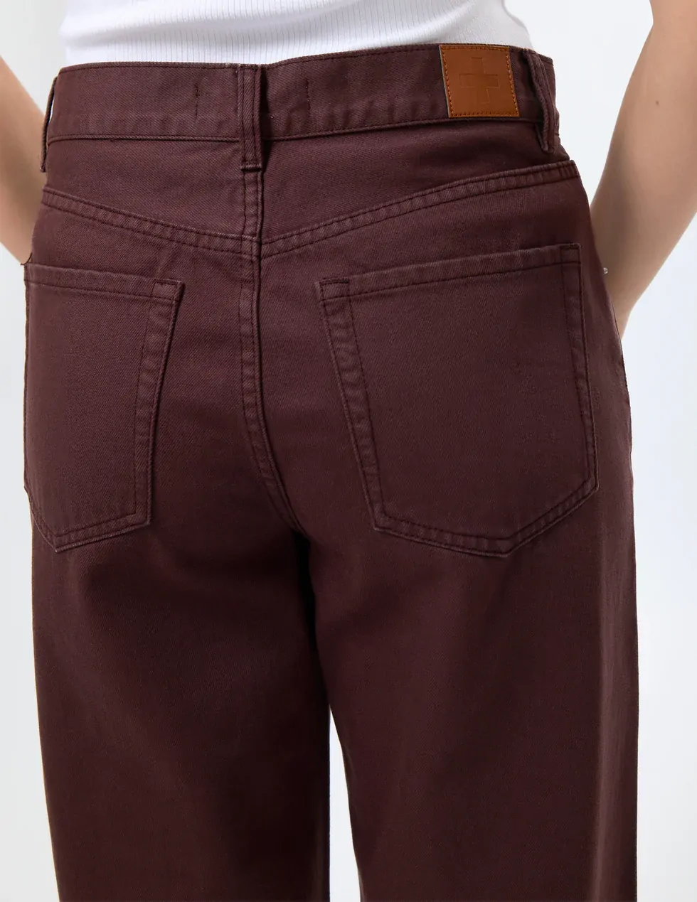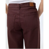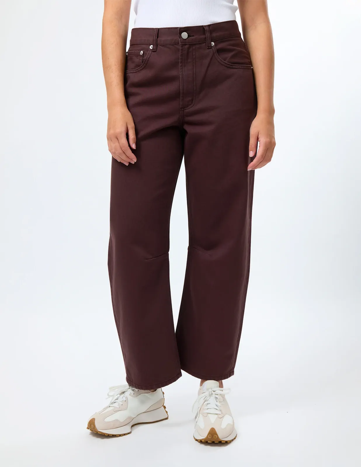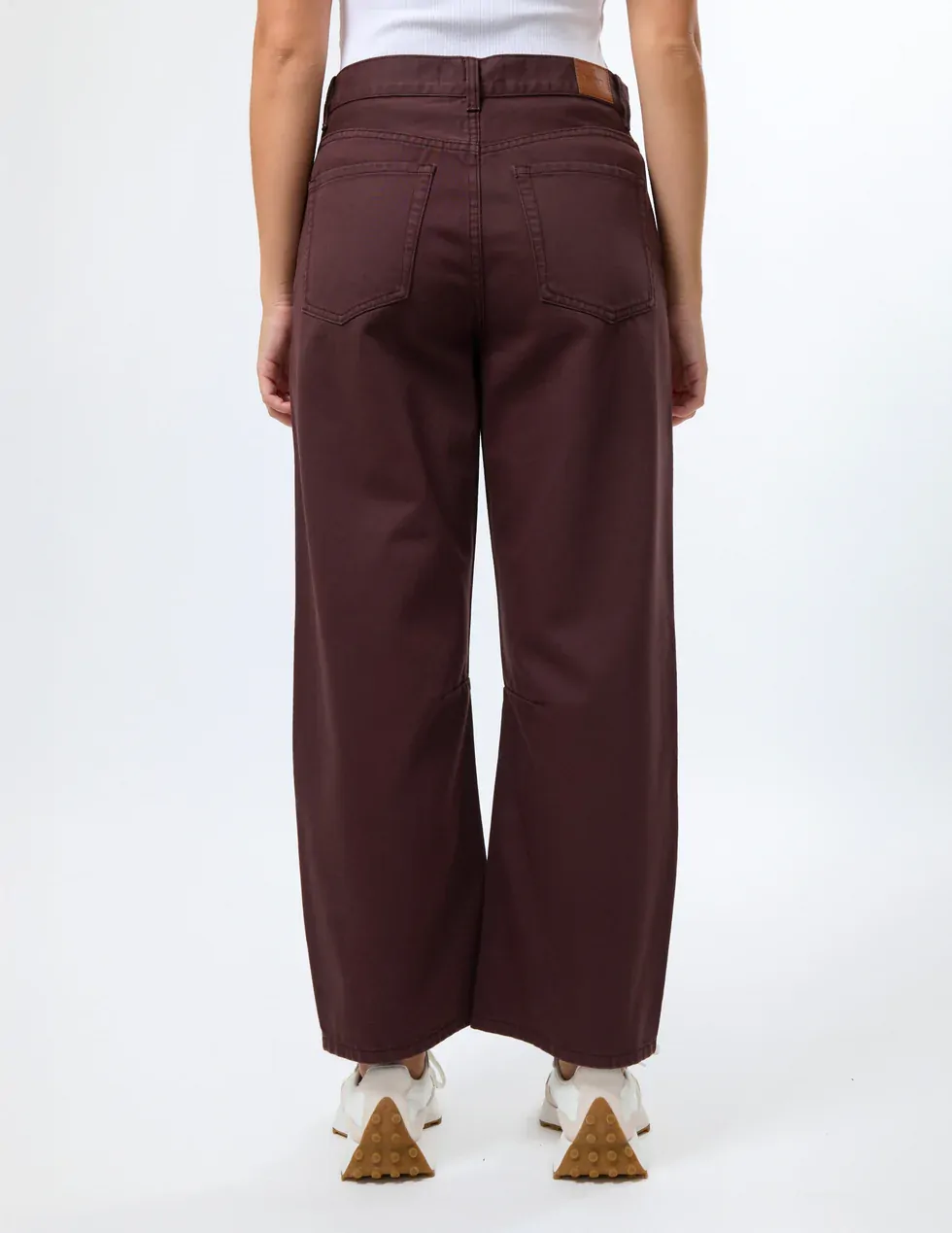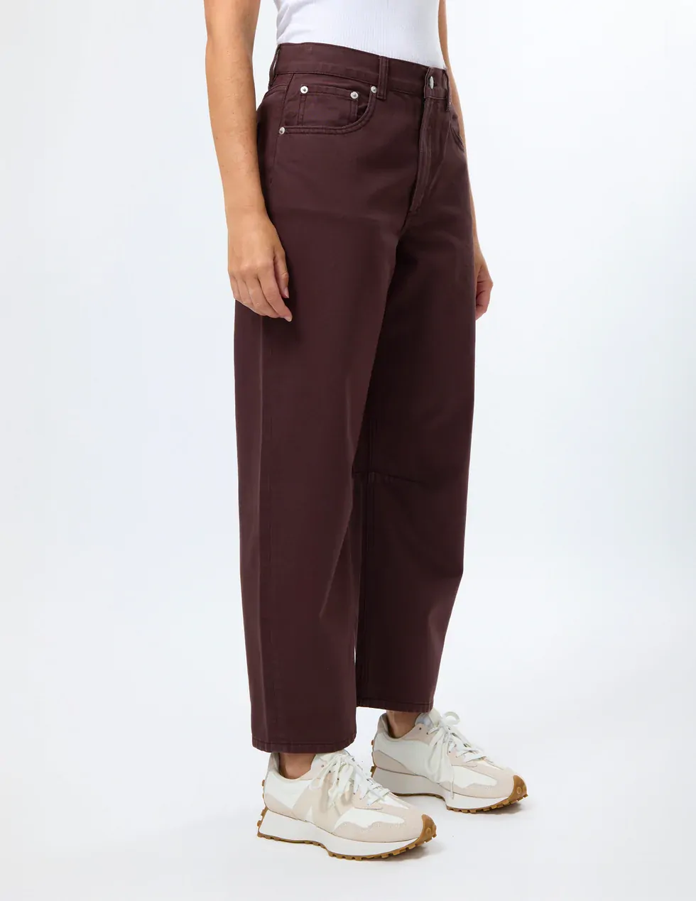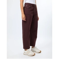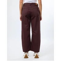 Ankle length barrel leg jean with zip fly and inner knee seam tuck detail. Back waist logo patch.