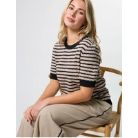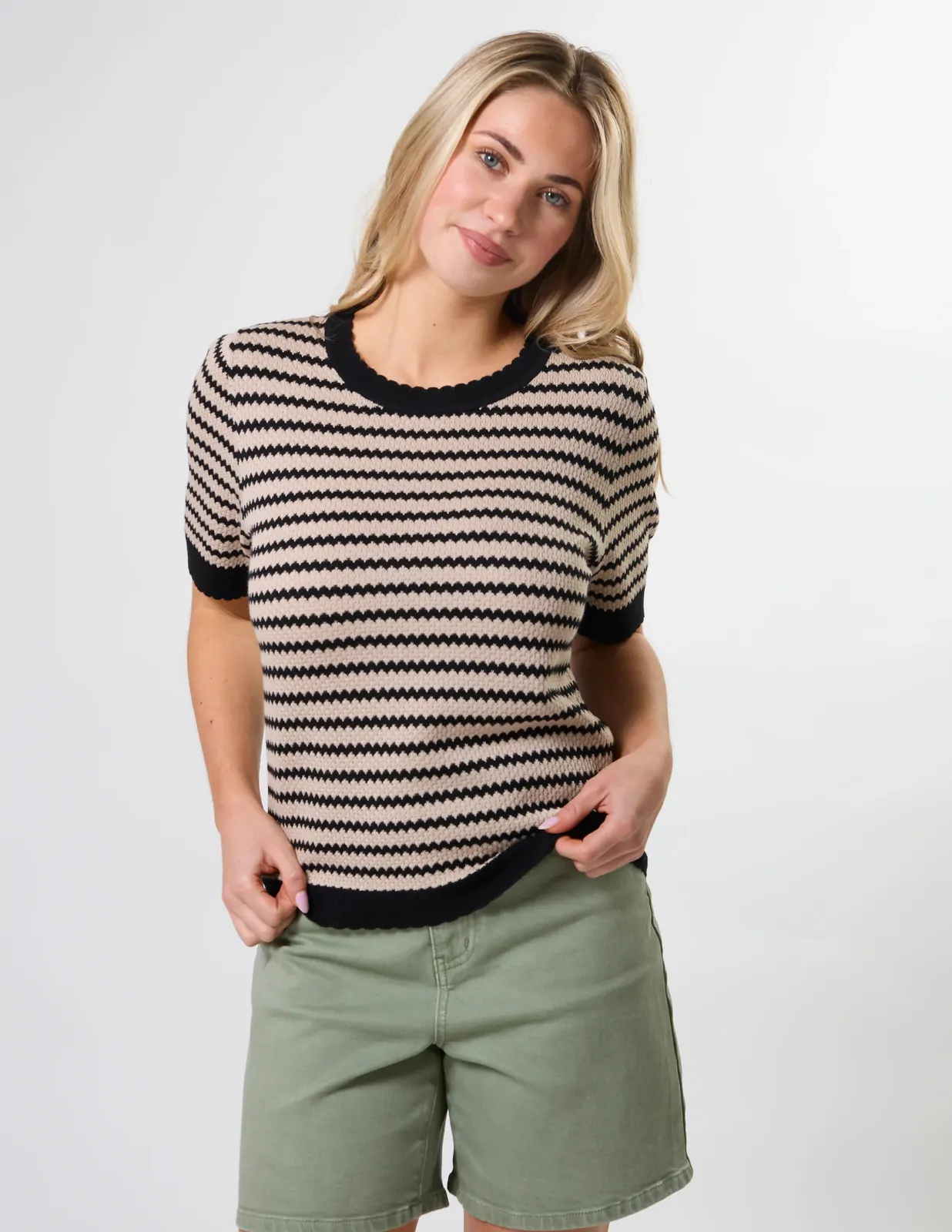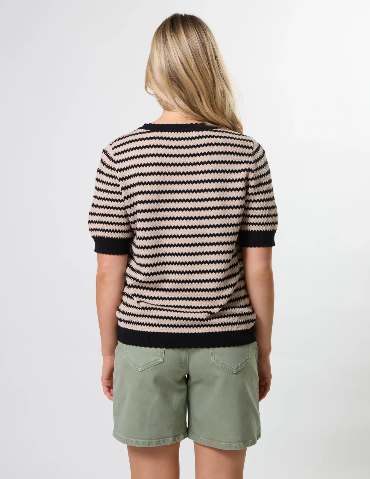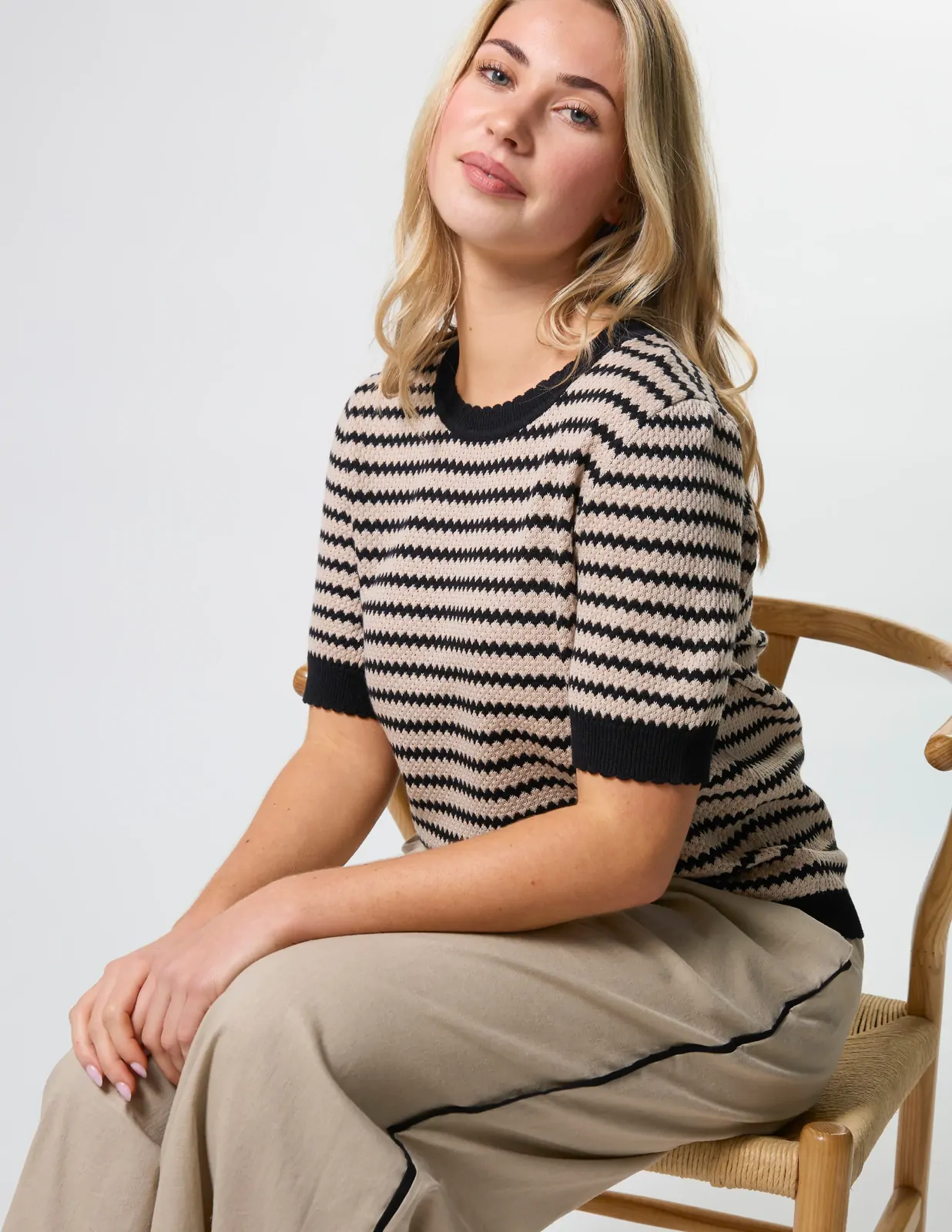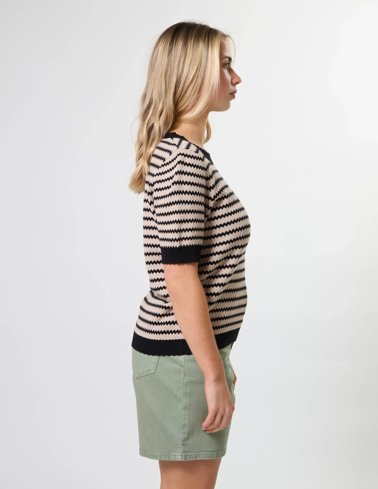 Crew knit knit top with curved stripe design and scalloped edges on neckline, cuffs and hem.