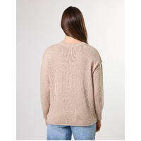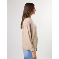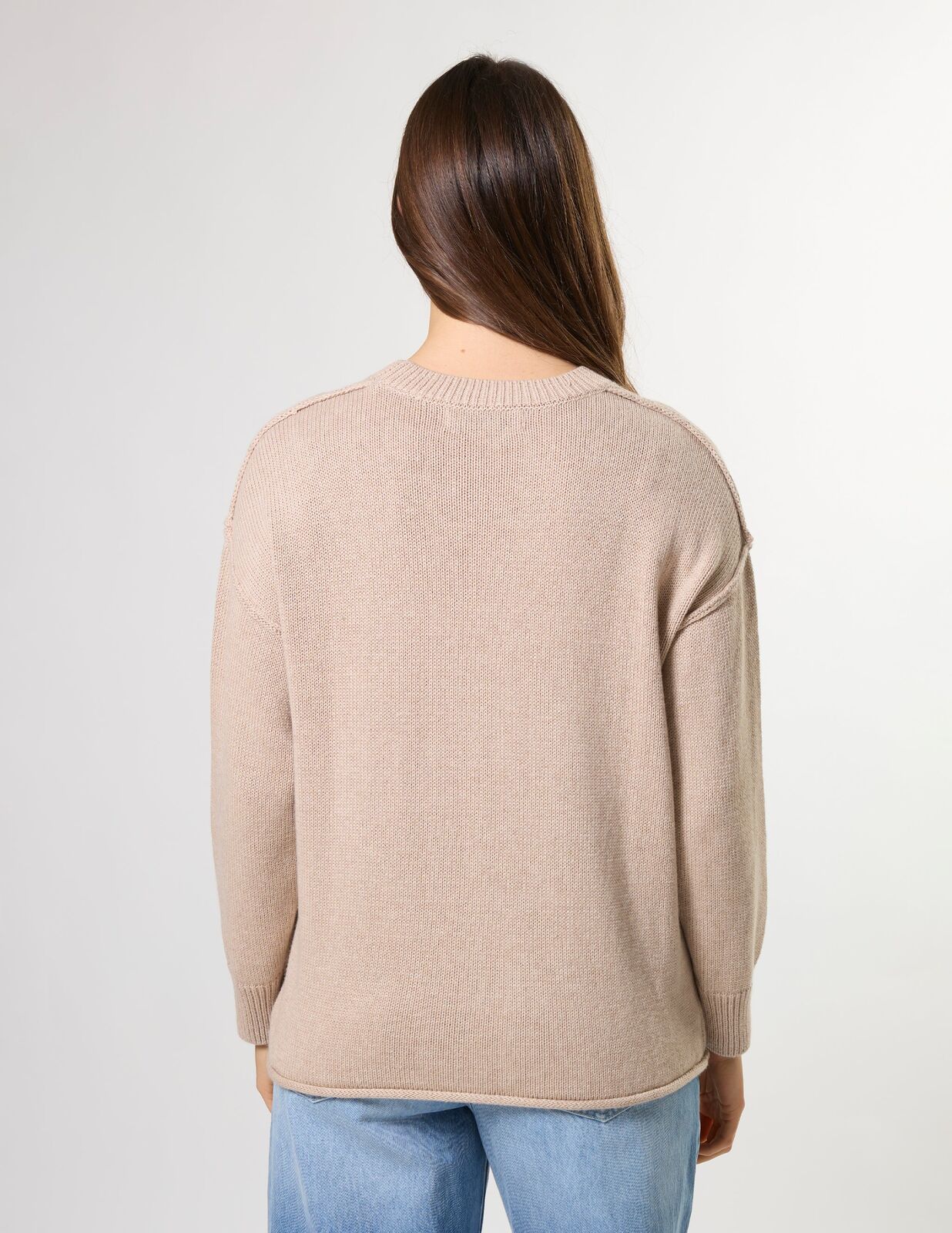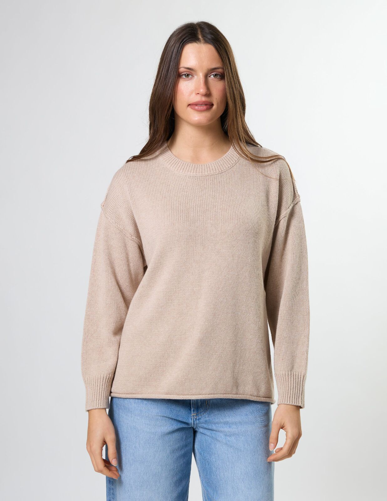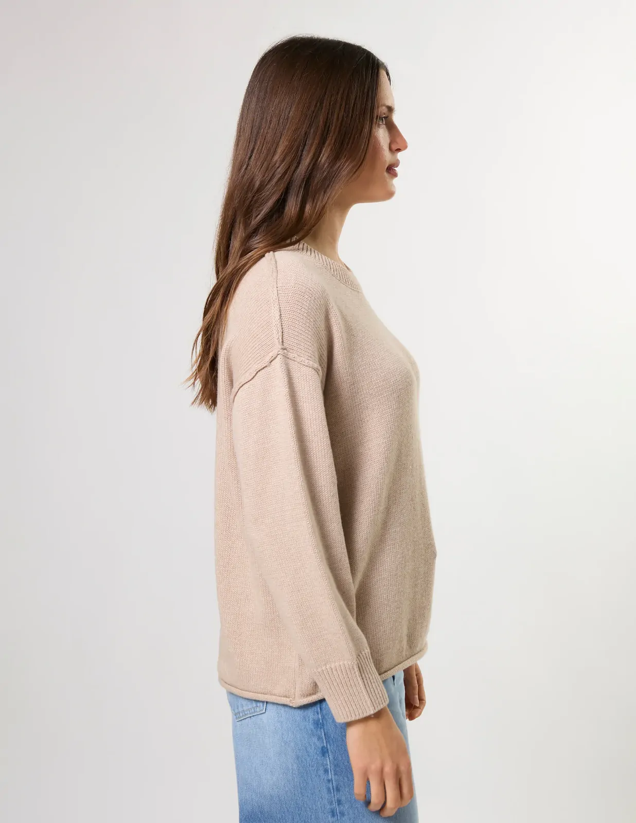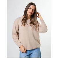 Crew neck knit with rib neckline and cuffs, exposed seam details and rolled hem edge.
