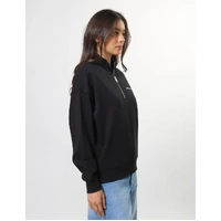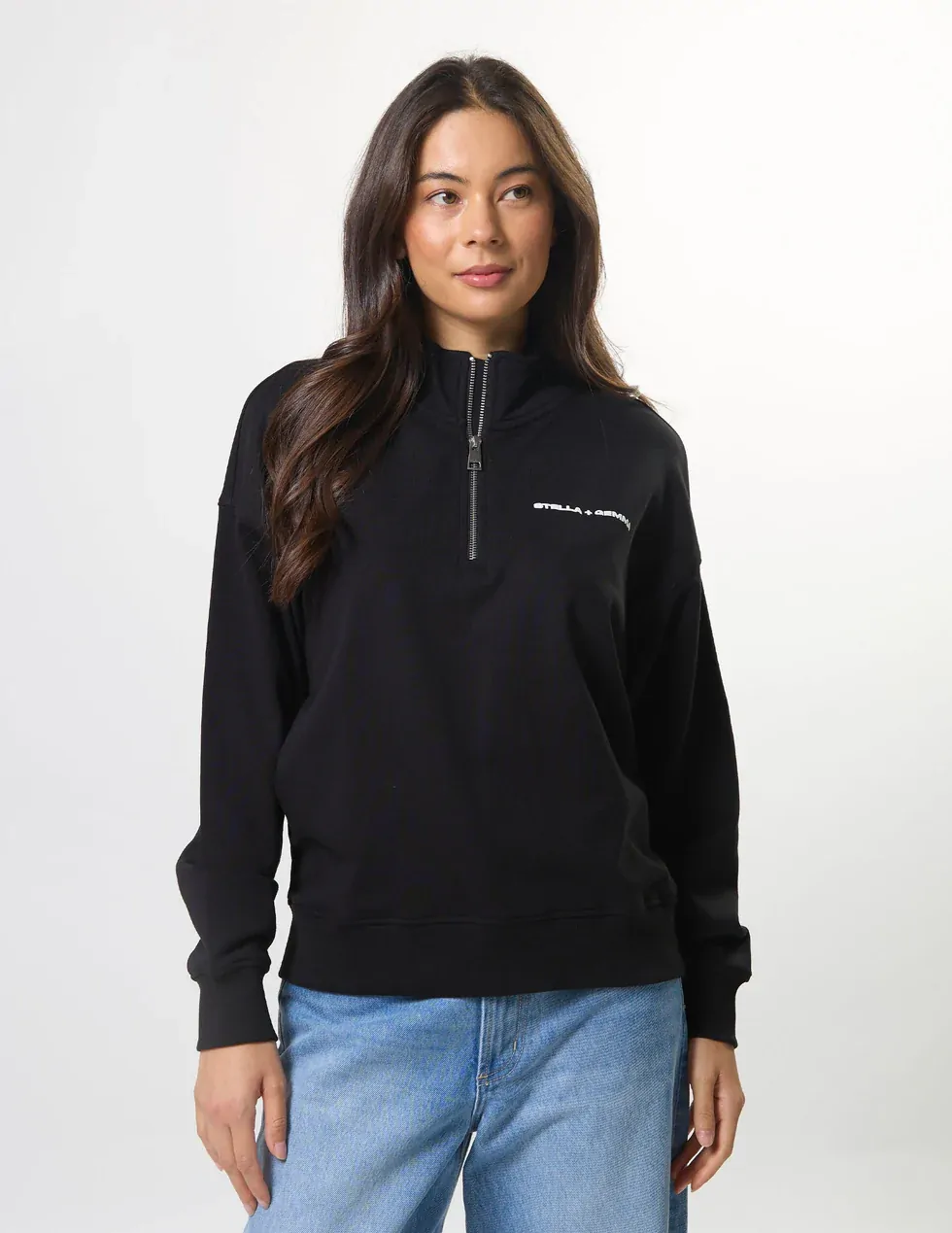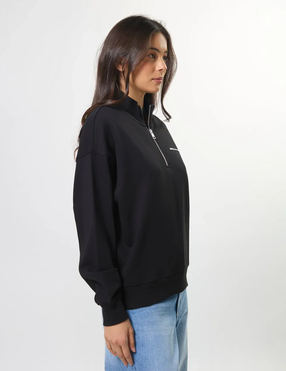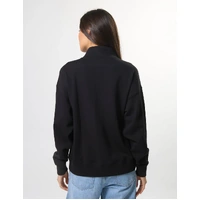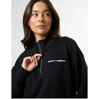 Relaxed fit dropped shoulder sweat with self fabric collar stand and ¼ zip opening at neckline. Rib cuffs and hem