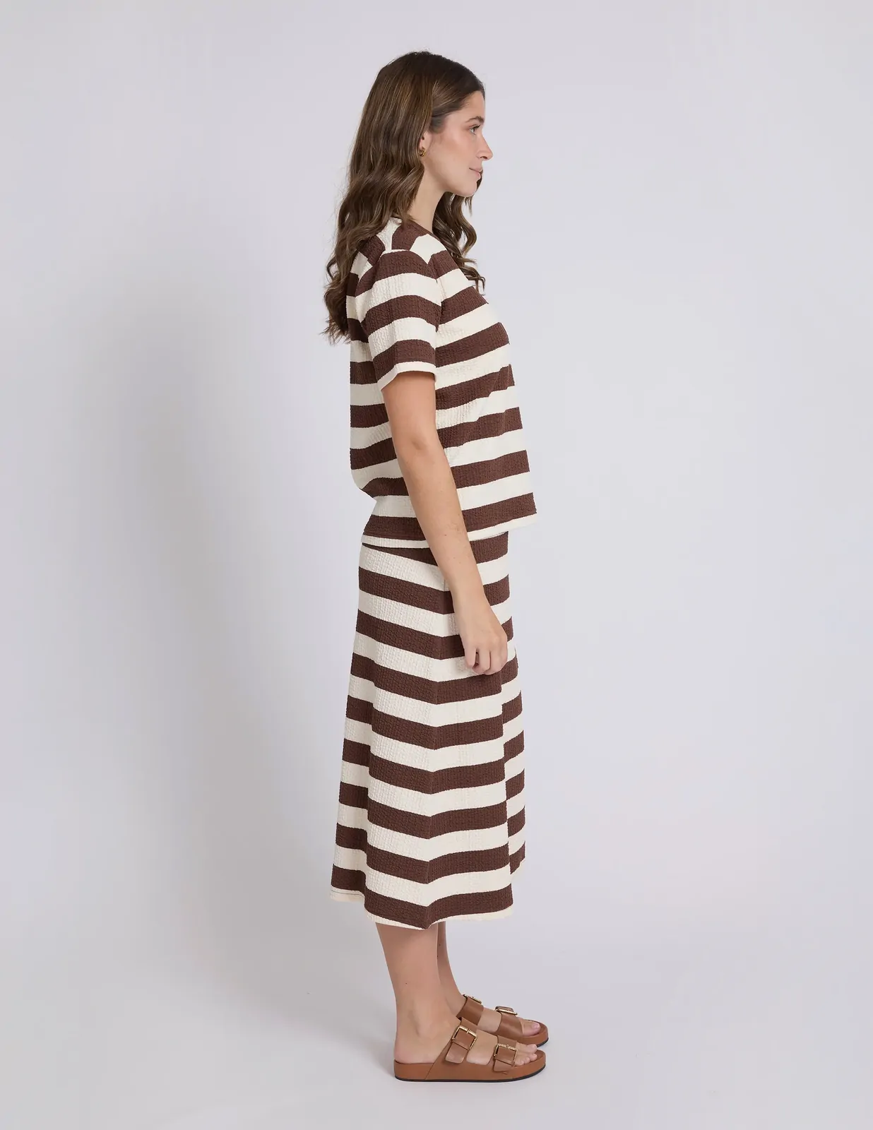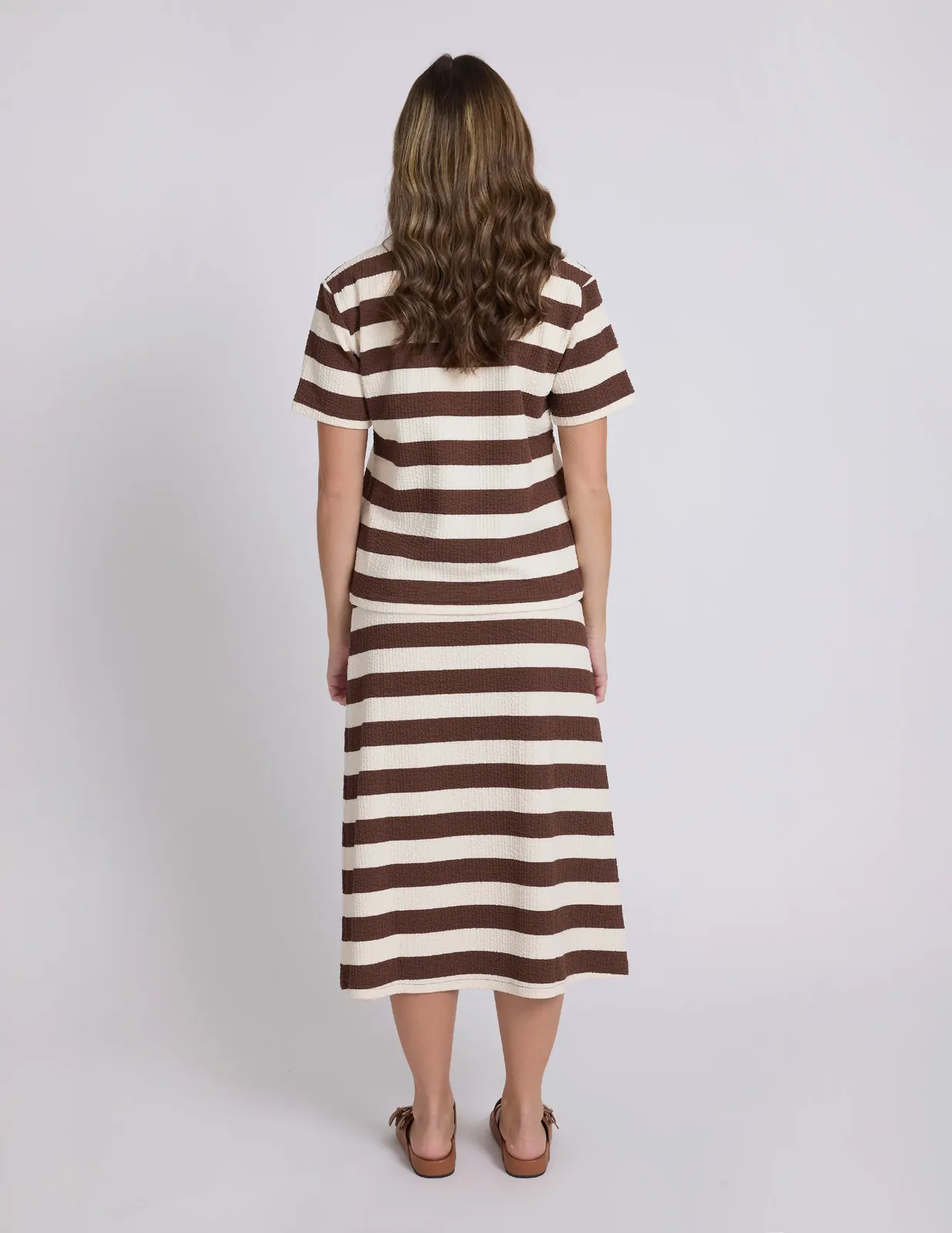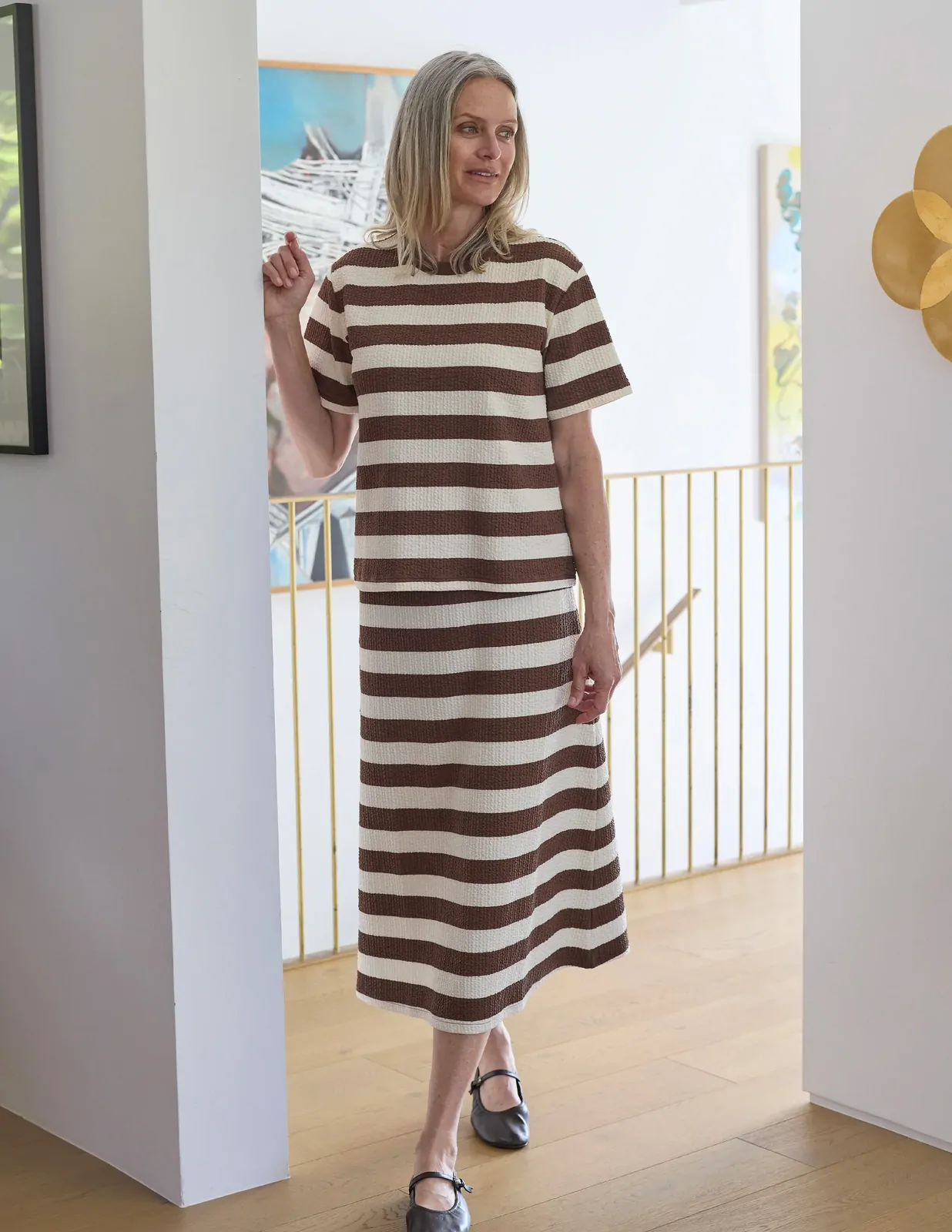 Textured jersey knit top in bold stripe. Crew neck with short sleeves and relaxed fit body.