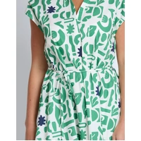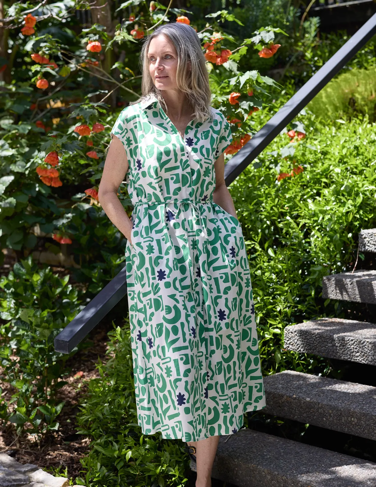 Midi cap sleeve dress with concealed placket button front, open collar neckline, side pockets and self fabric narrow width tie belt