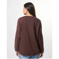 Relaxed crew neckline with v insert over stitching, hi-low hem and angled side seams with front pockets