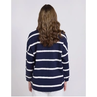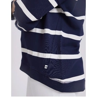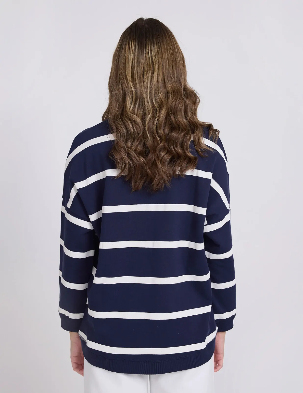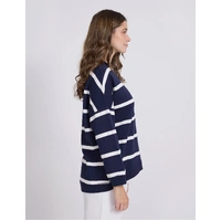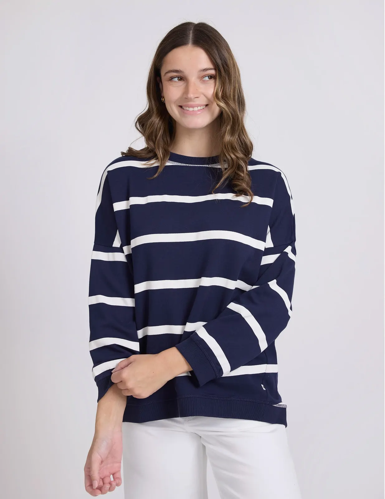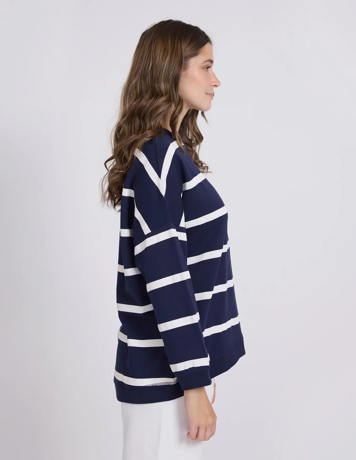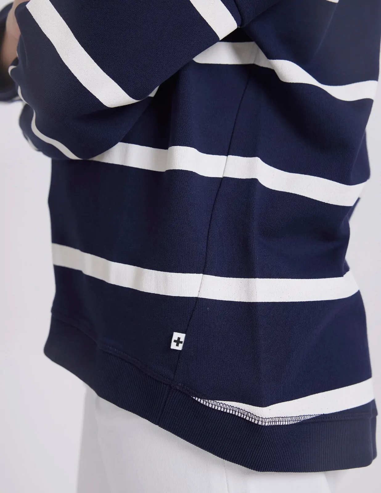 Relaxed crew neckline with hi-lo hem and angled side seams. Pockets angled on front seams with v stitching detail at neckline