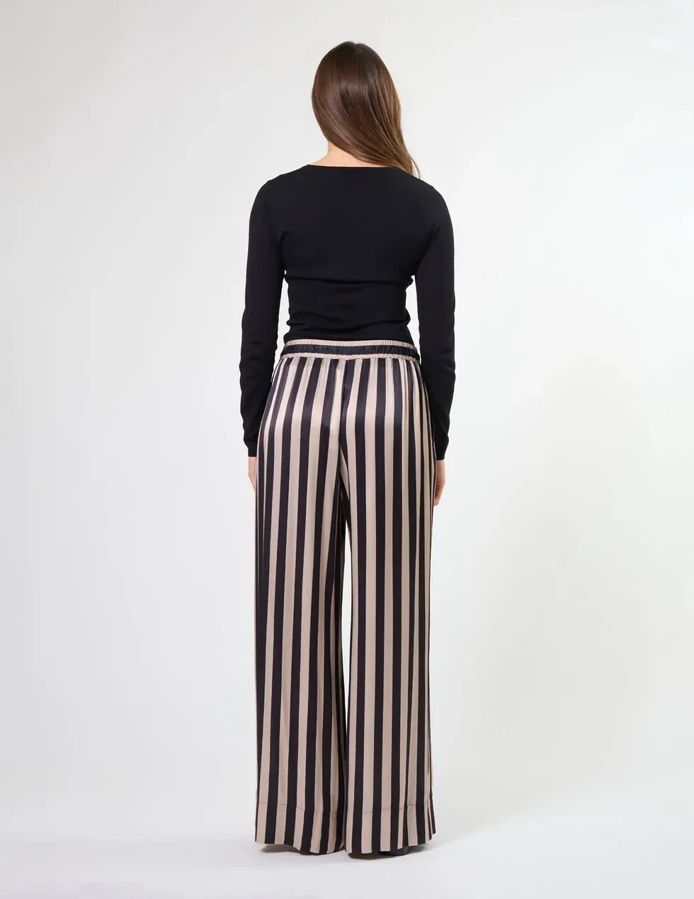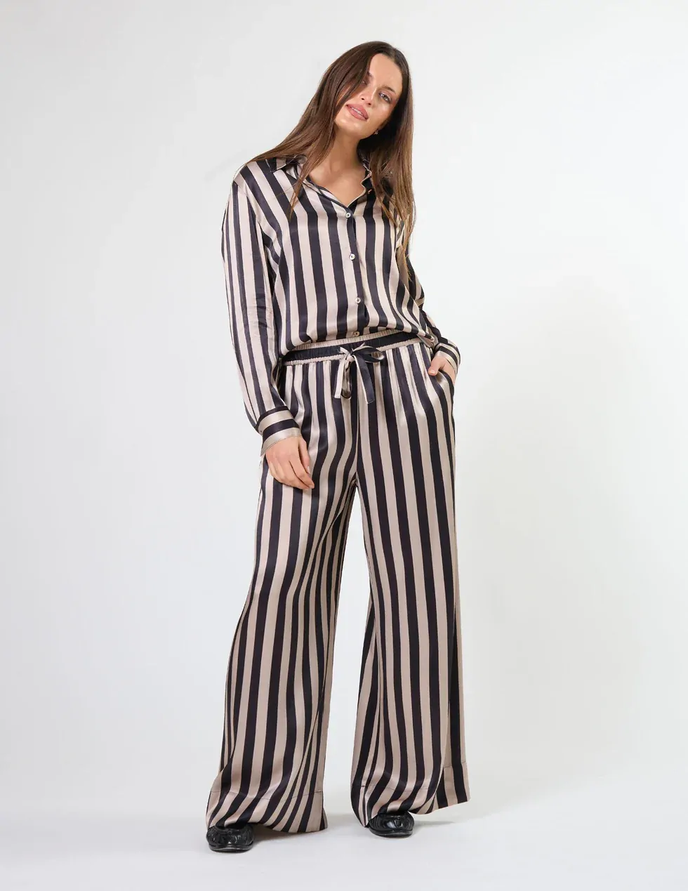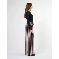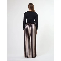 Relaxed fit satin striped pant with elasticated waist, self fabric tie and wide hem detail. Side angle pockets.