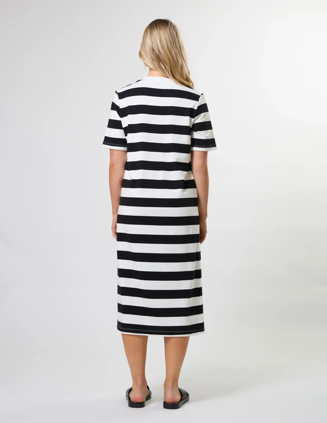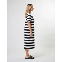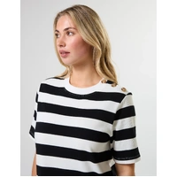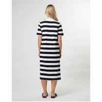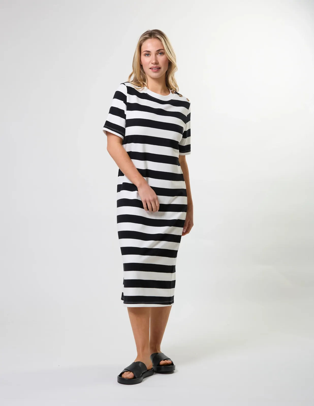 Midi length jersey knit striped t-shirt dress with novelty shoulder button fastening on one side
