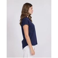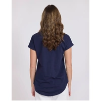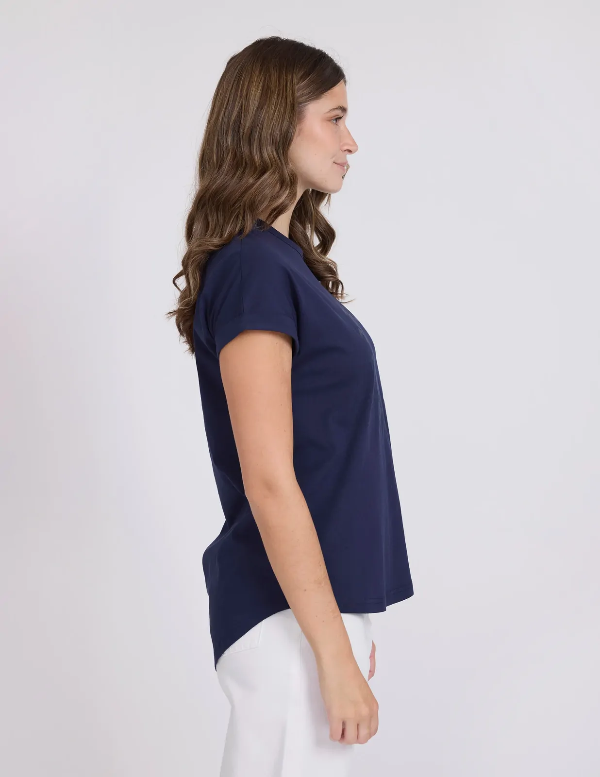 Relaxed fit crew with longer scoop back hemline.