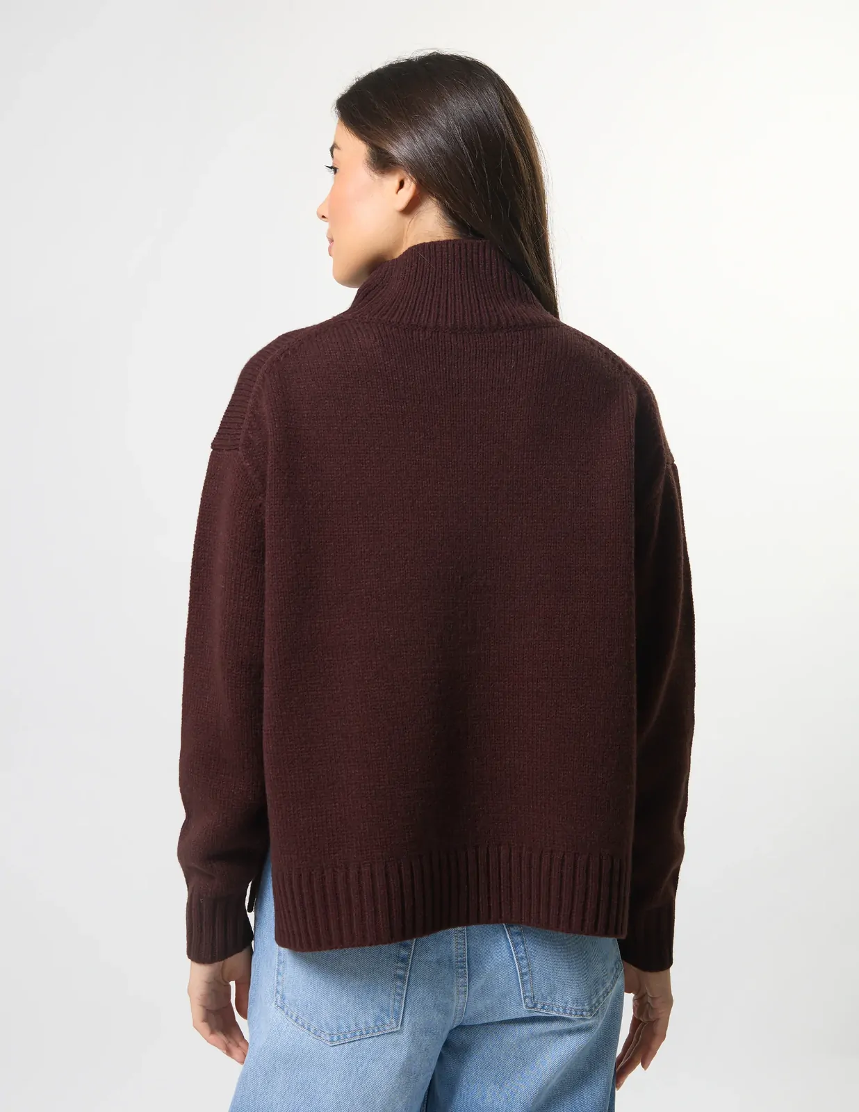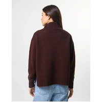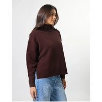 Relaxed fit high neck knit with fashioning details around armholes and rib trims on neck, cuffs and hemline. Side splits at hem.