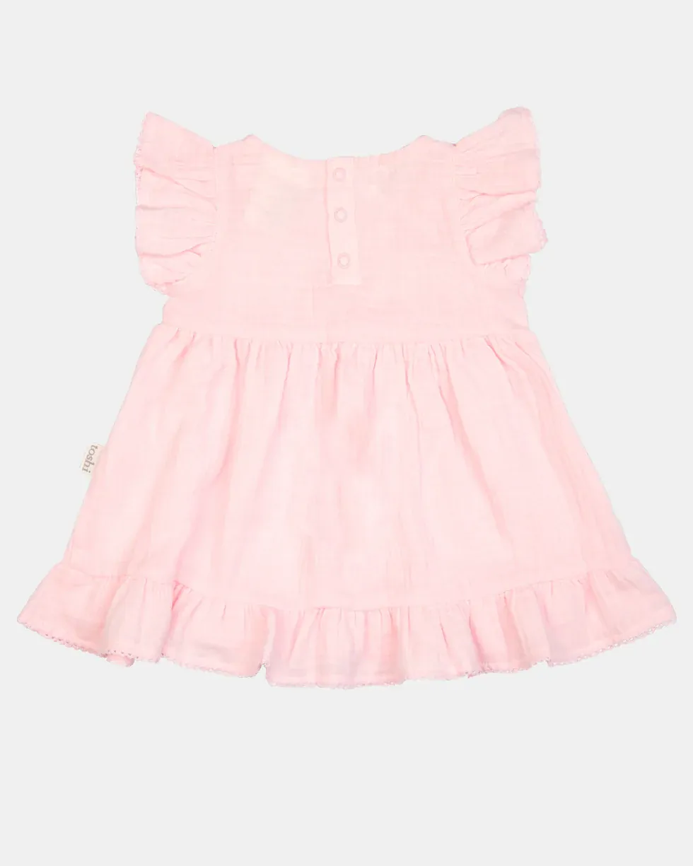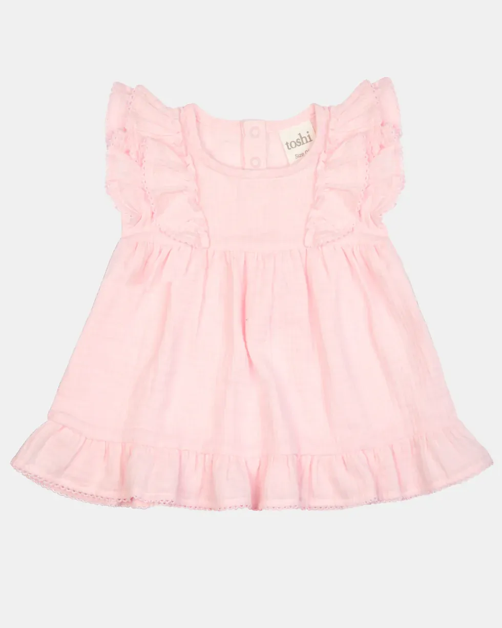 Toshi Baby Dress Sammy is crafted from the finest quality certified 100% organic cotton yarn. The cheesecloth fabrication features a supremely soft and gently nurturing texture. The classic colours create wardrobe staples, and are ideal for layering and transeasonal styling. The A-line shape is flattering and comfortable, with space for freedom of movement. Feature frill creates a playful and charming touch. The dress has back press studs for convenient dressing. The beautiful Toshi Baby Dress transitions effortlessly from casual occasions to special celebrations.