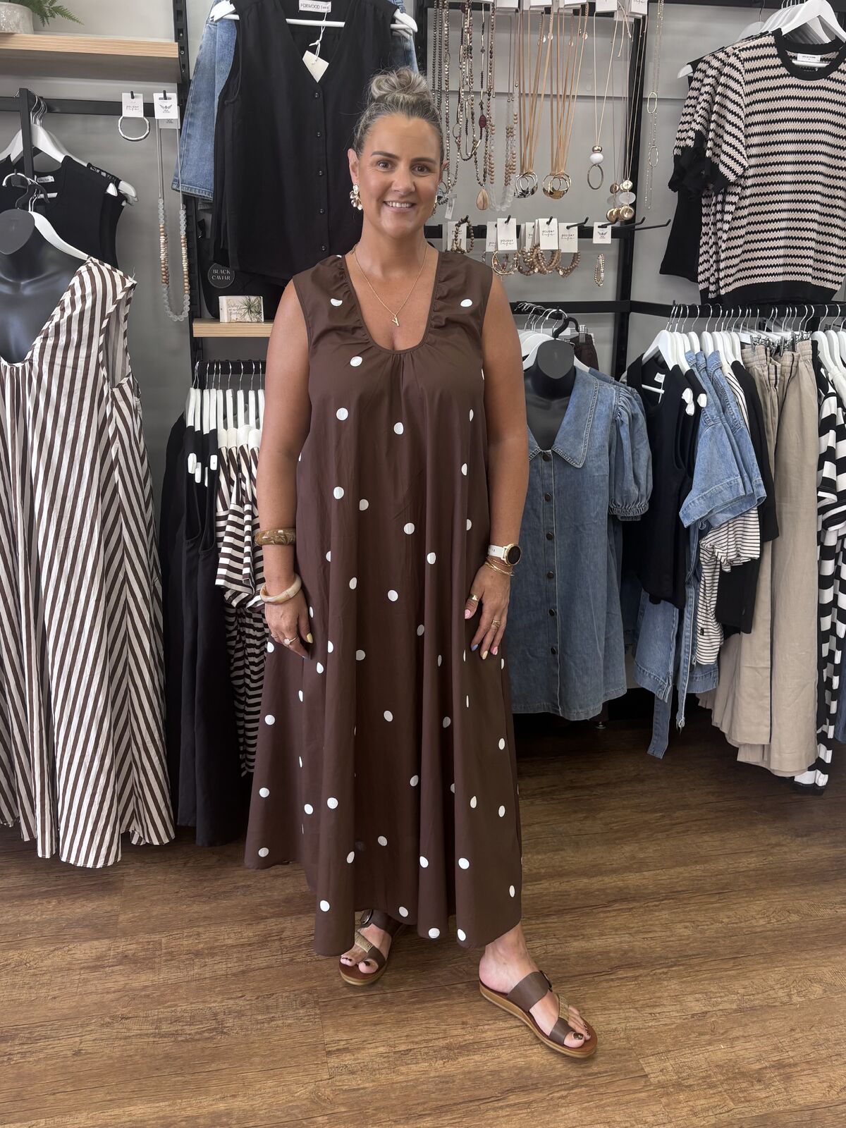YH & CO Scoop Polka Dot Maxi Dress - Chocolate/White